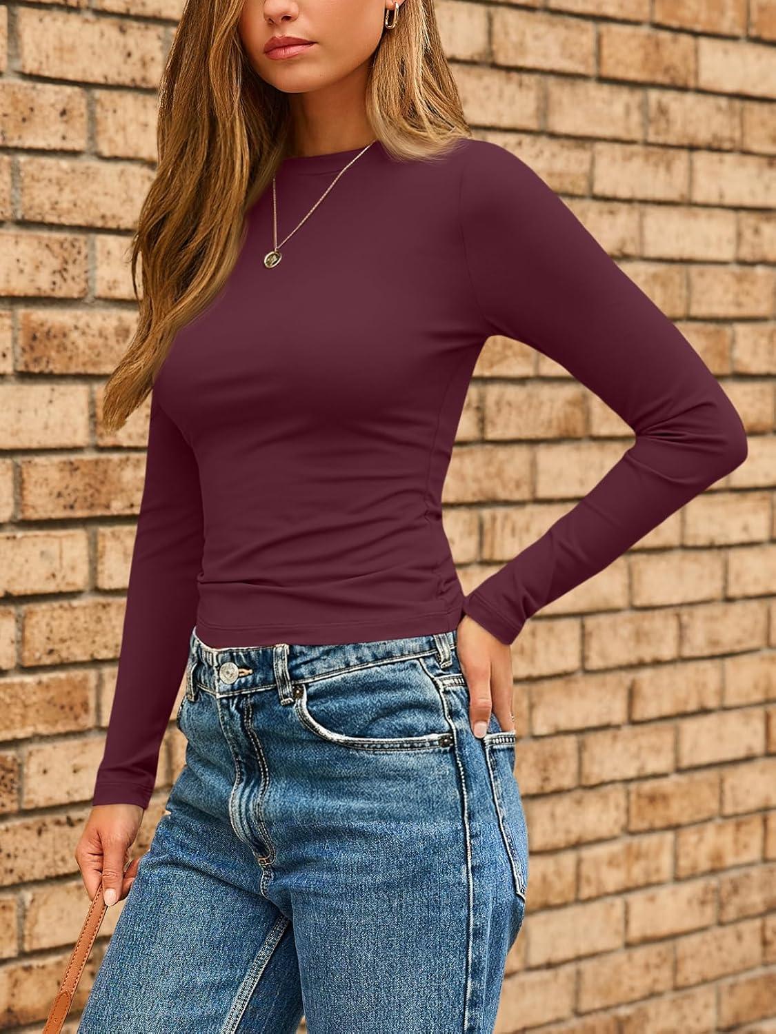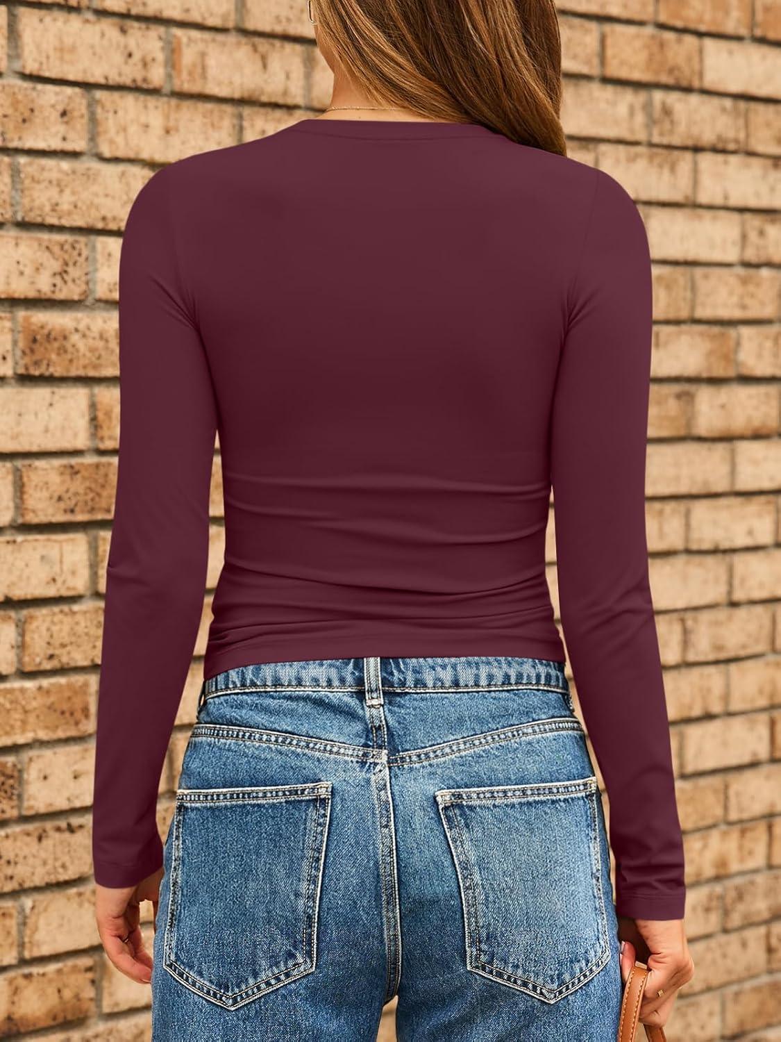 AUTOMET Womens Long Sleeve Shirts Basic Compression Going Out Crop Tops Fall Fashion Y2K Clothes 2025(Winered)
