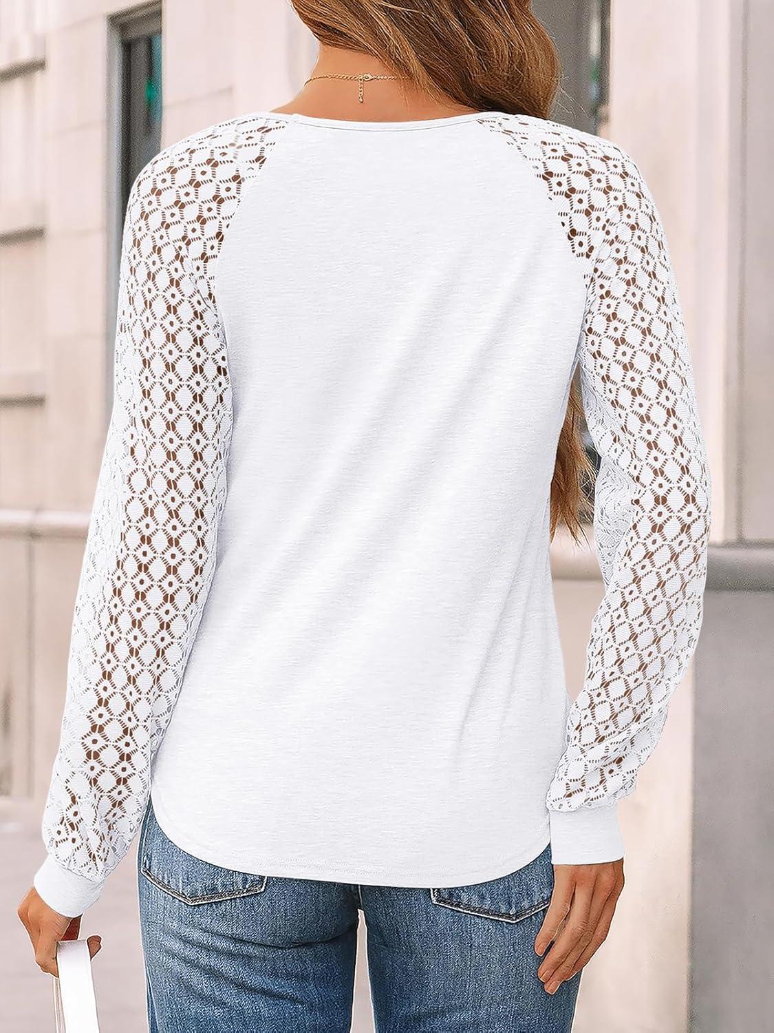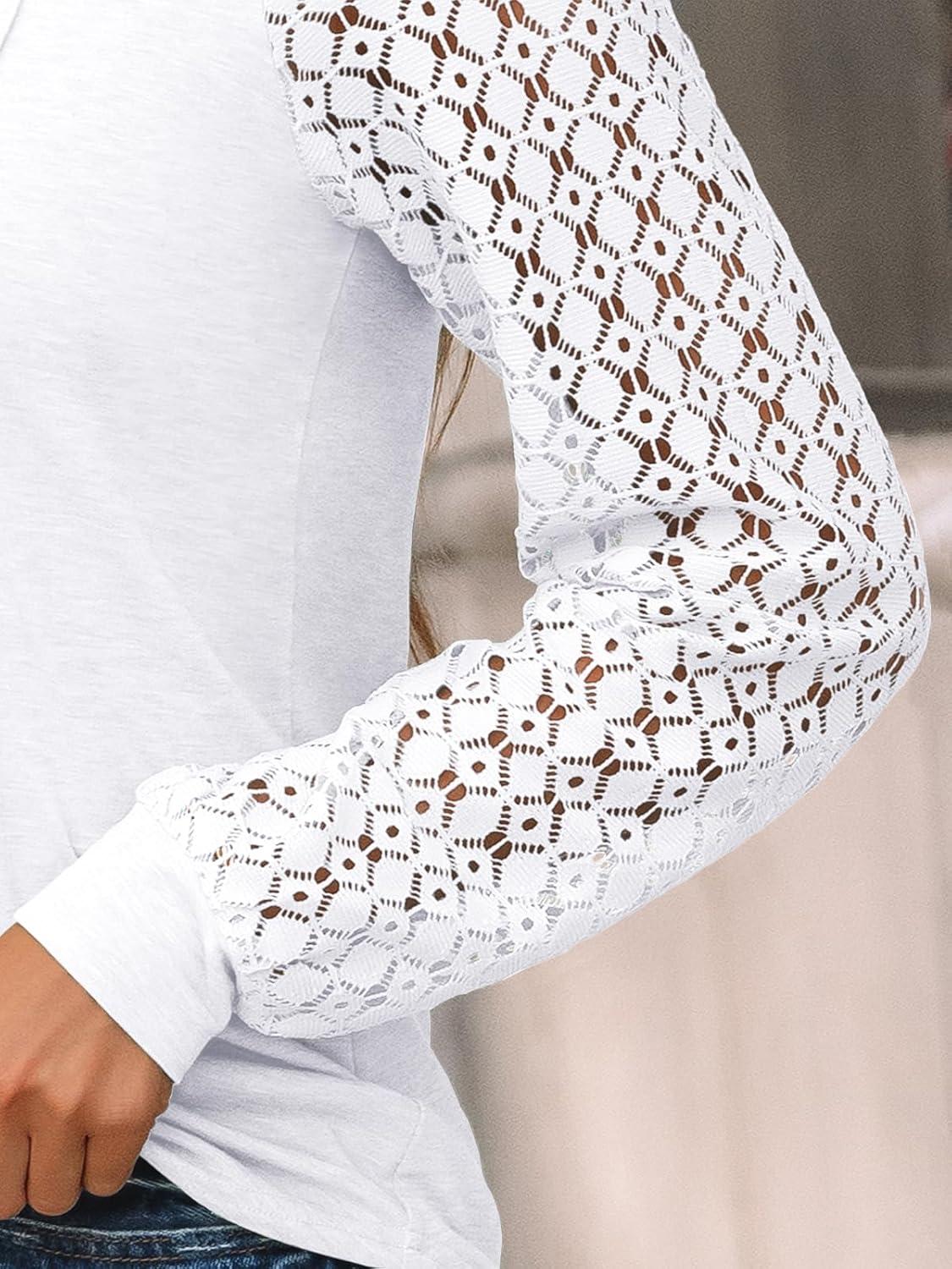 AUTOMET Womens Long Sleeve Shirts Business Casual Dressy Tops Lace Crewneck Work Trendy Fall Fashion Outfits Clothes(White)