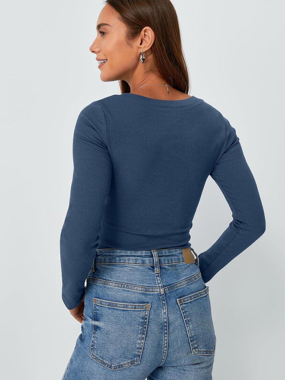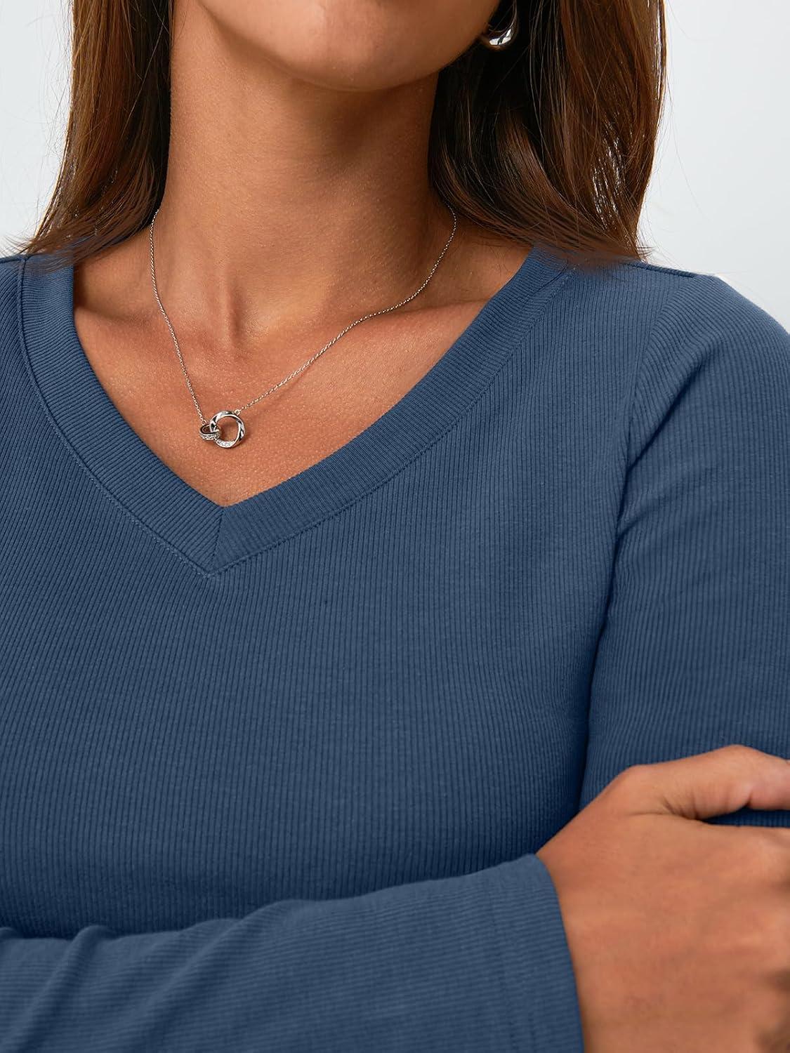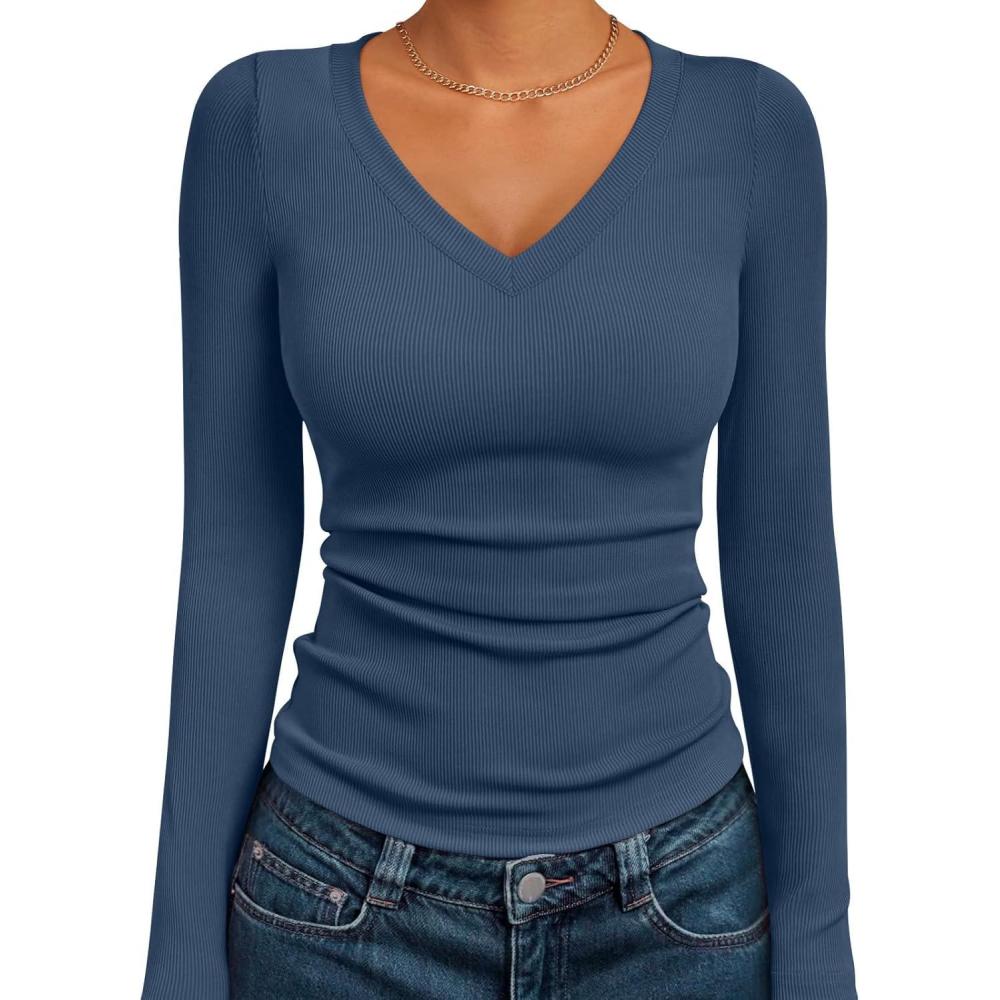 AUTOMET Womens Long Sleeve Shirts Fall Outfits Fashion Tops V Neck Ribbed Basic Casual Clothes Winter Underscrub(Hazeblue)