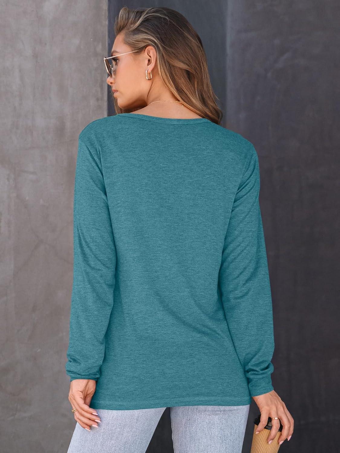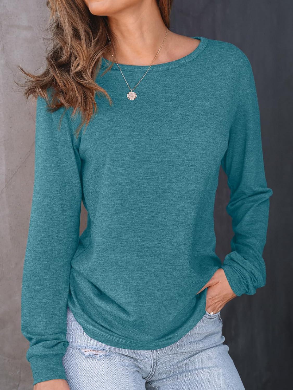 AUTOMET Women’s Long Sleeve Shirts Fall Solid Color Loose Fit Tunics Tops Oversized Basic Tees Business Casual Outfits(Blue Green)