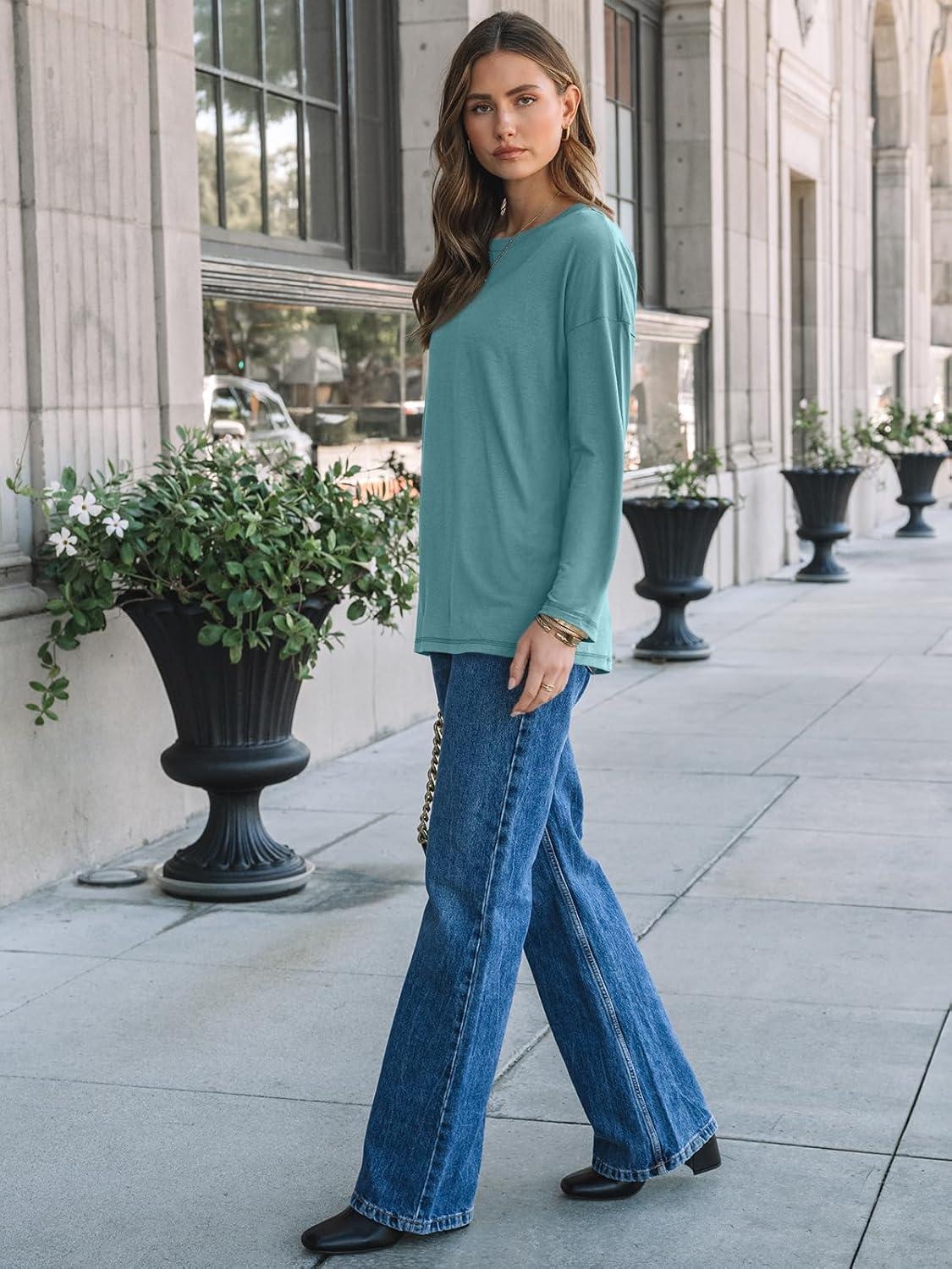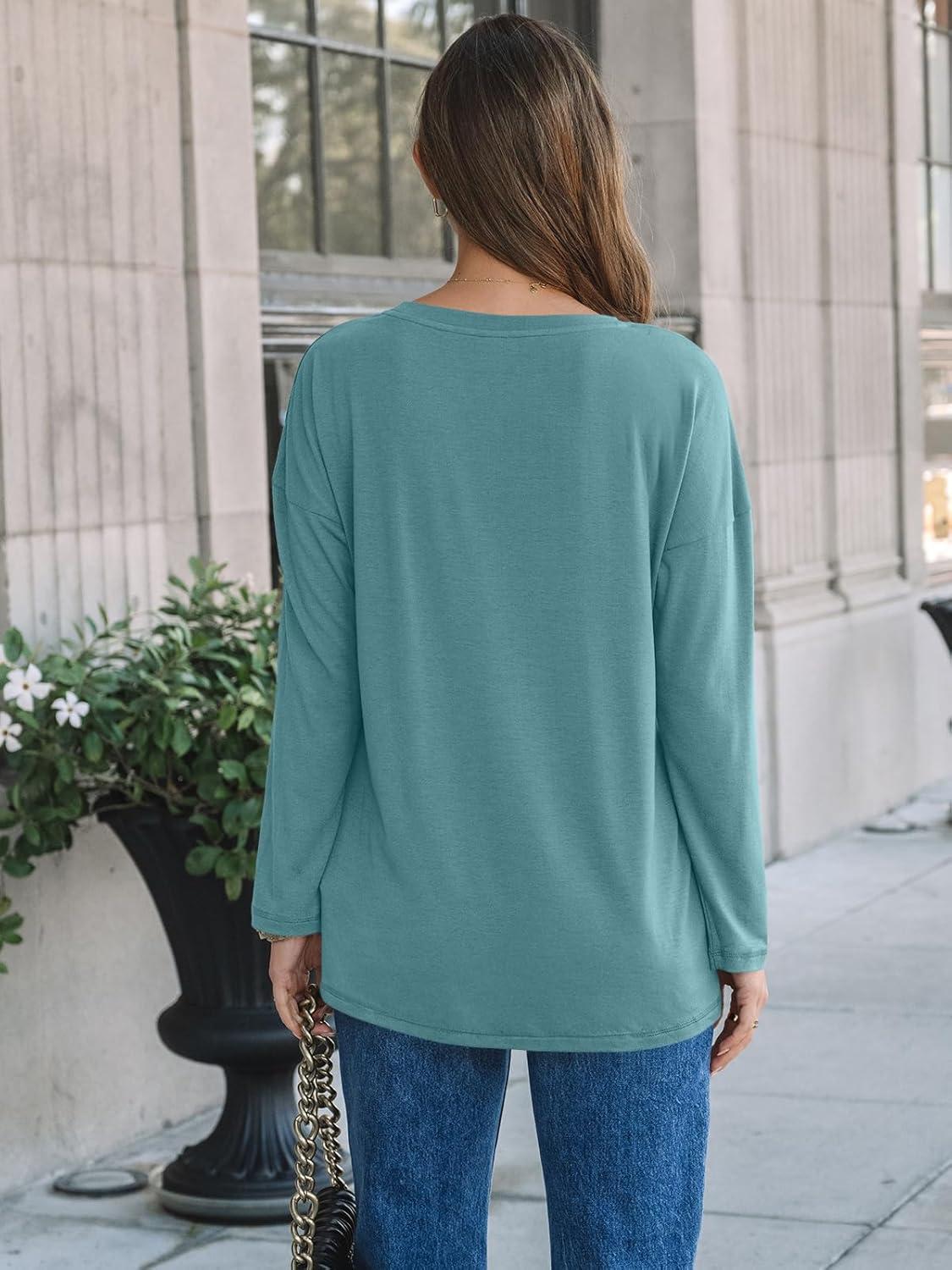 AUTOMET Womens Long Sleeve Shirts Loose Fitted Crewneck Basic Tops Casual Outfits Fall Clothes 2025(Cyan)