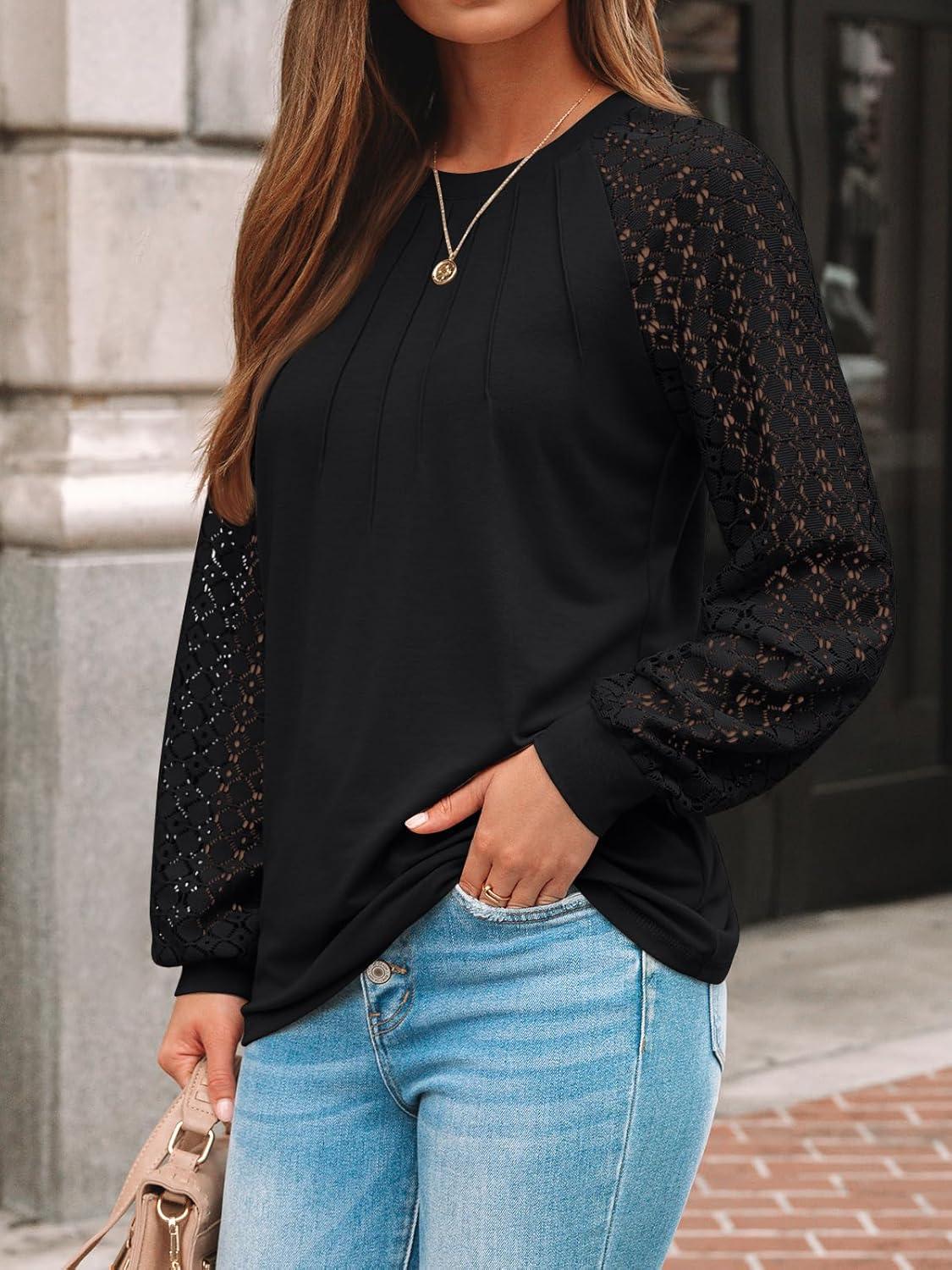 AUTOMET Womens Long Sleeve Shirts Pleated Lace Tops Fall Fashion Outfits Business Casual Blouses(Black)