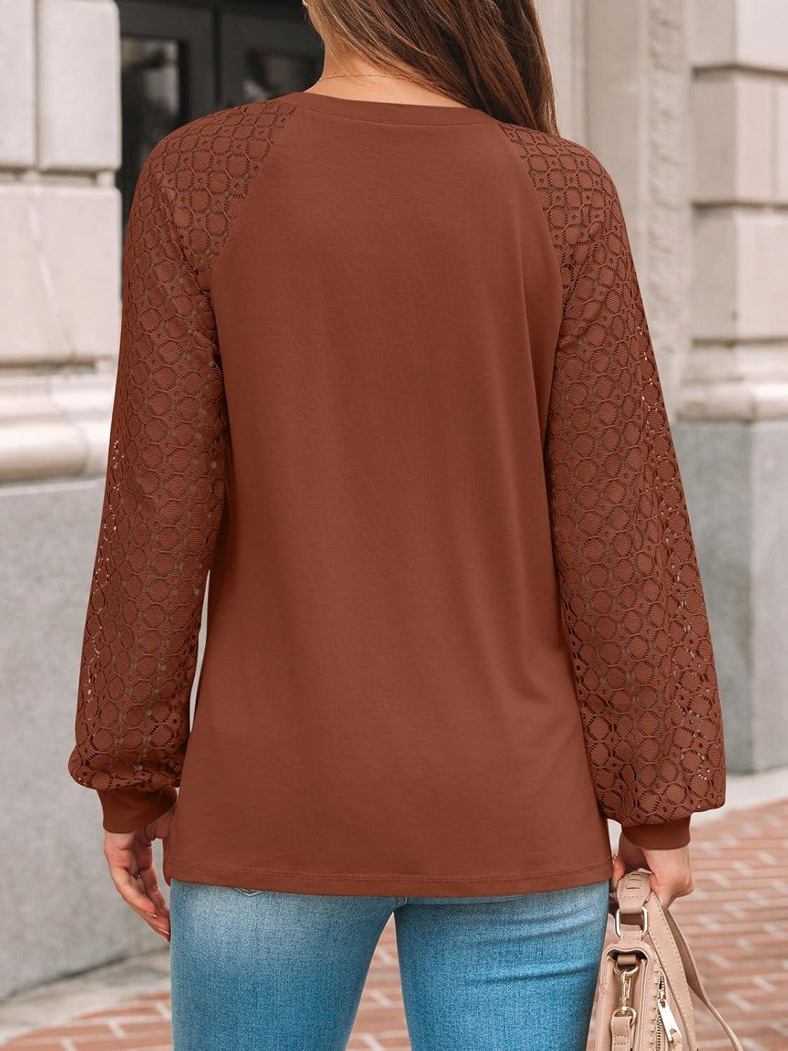 AUTOMET Womens Long Sleeve Shirts Pleated Lace Tops Fall Fashion Outfits Business Casual Blouses(Brown)