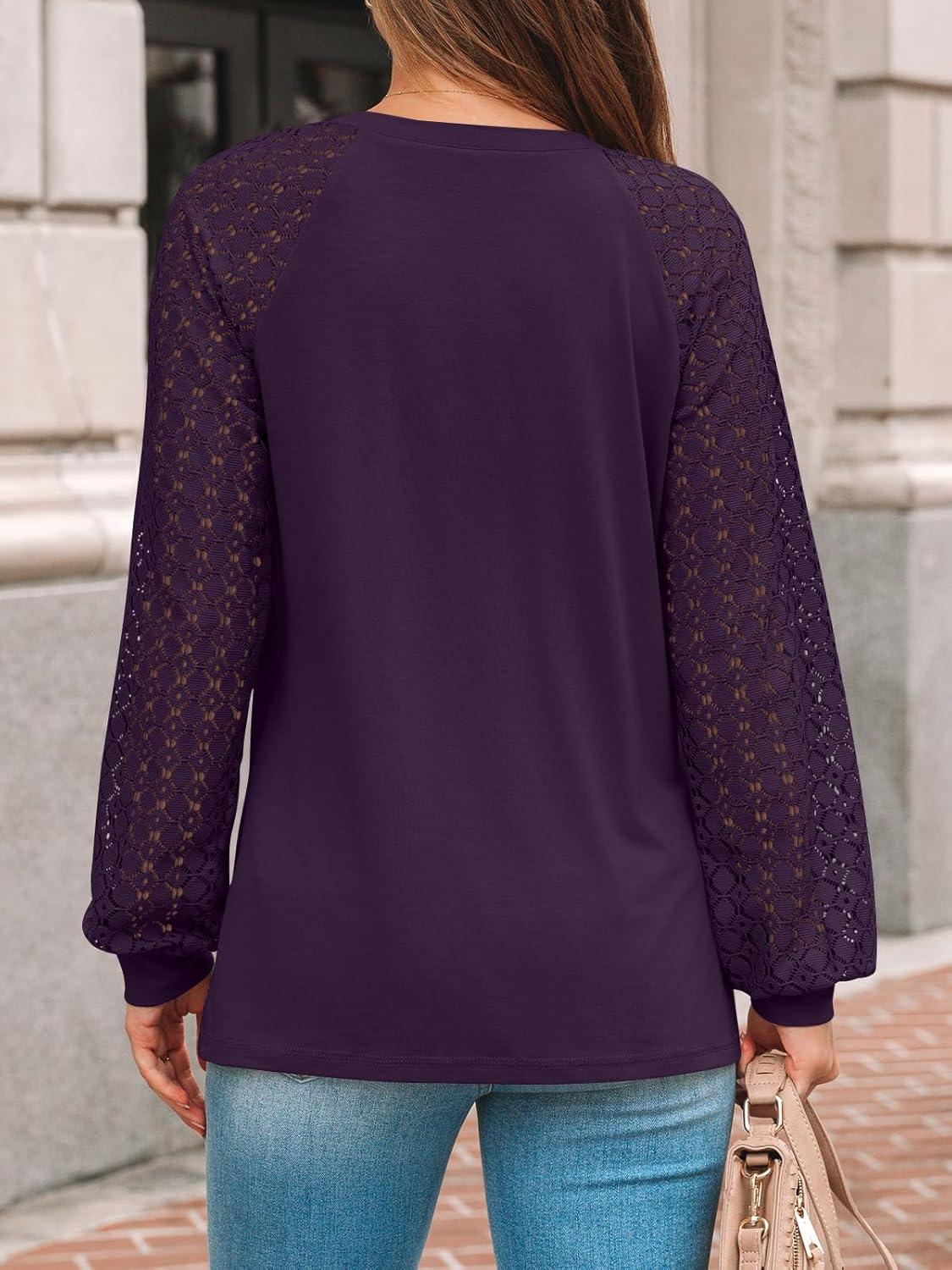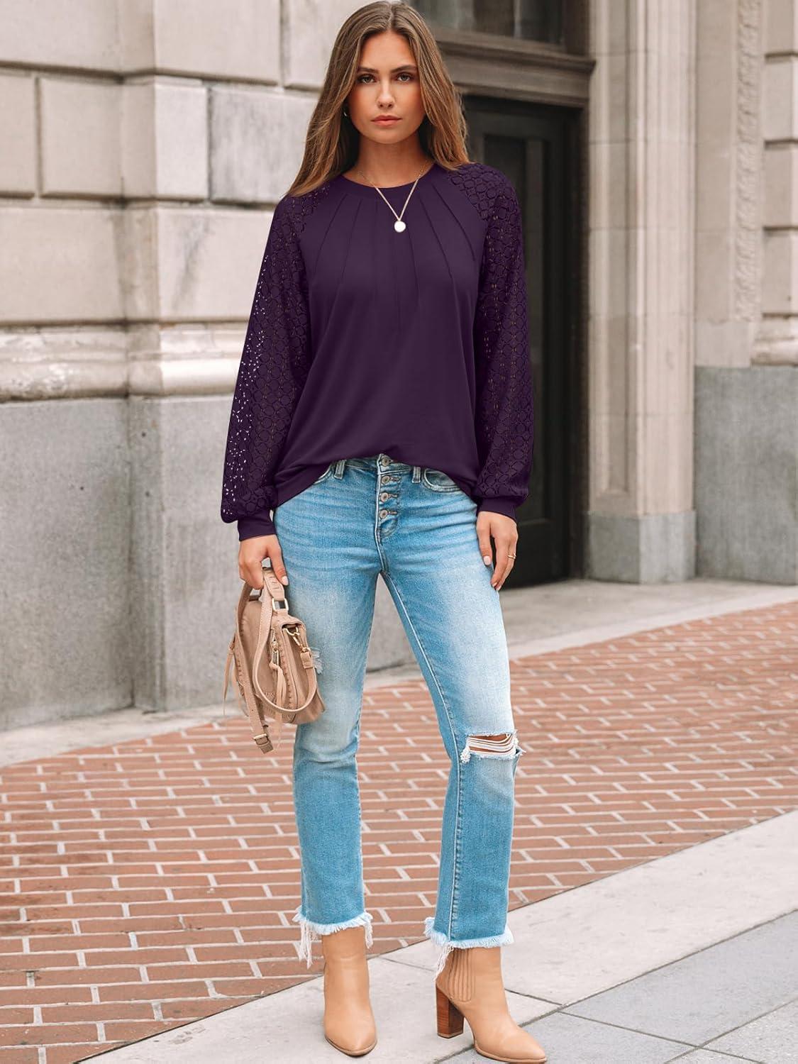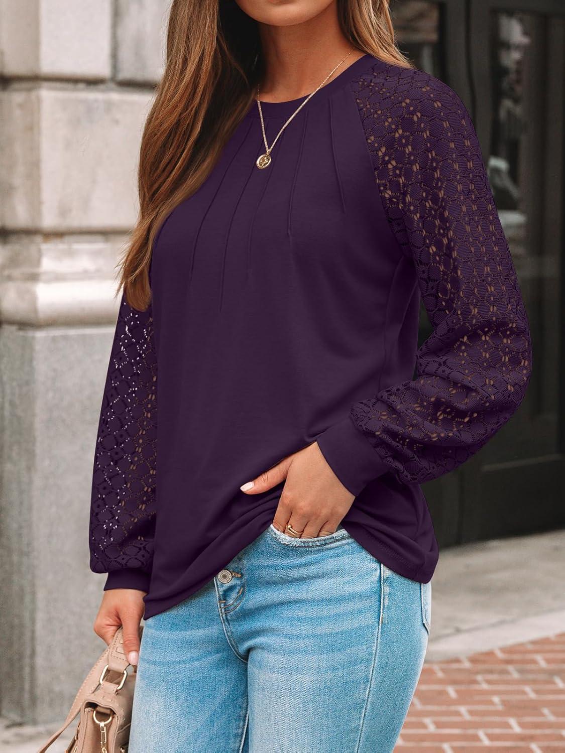 AUTOMET Womens Long Sleeve Shirts Pleated Lace Tops Fall Fashion Outfits Business Casual Blouses(Darkpurple)