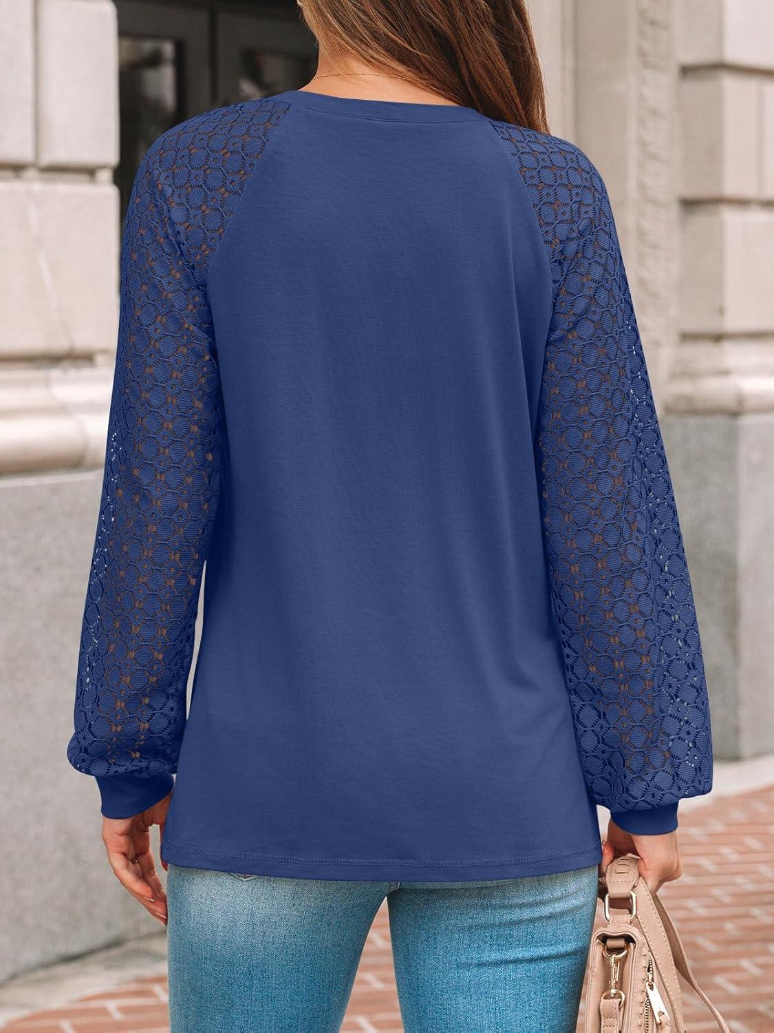 AUTOMET Womens Long Sleeve Shirts Pleated Lace Tops Fall Fashion Outfits Business Casual Blouses(Navy)