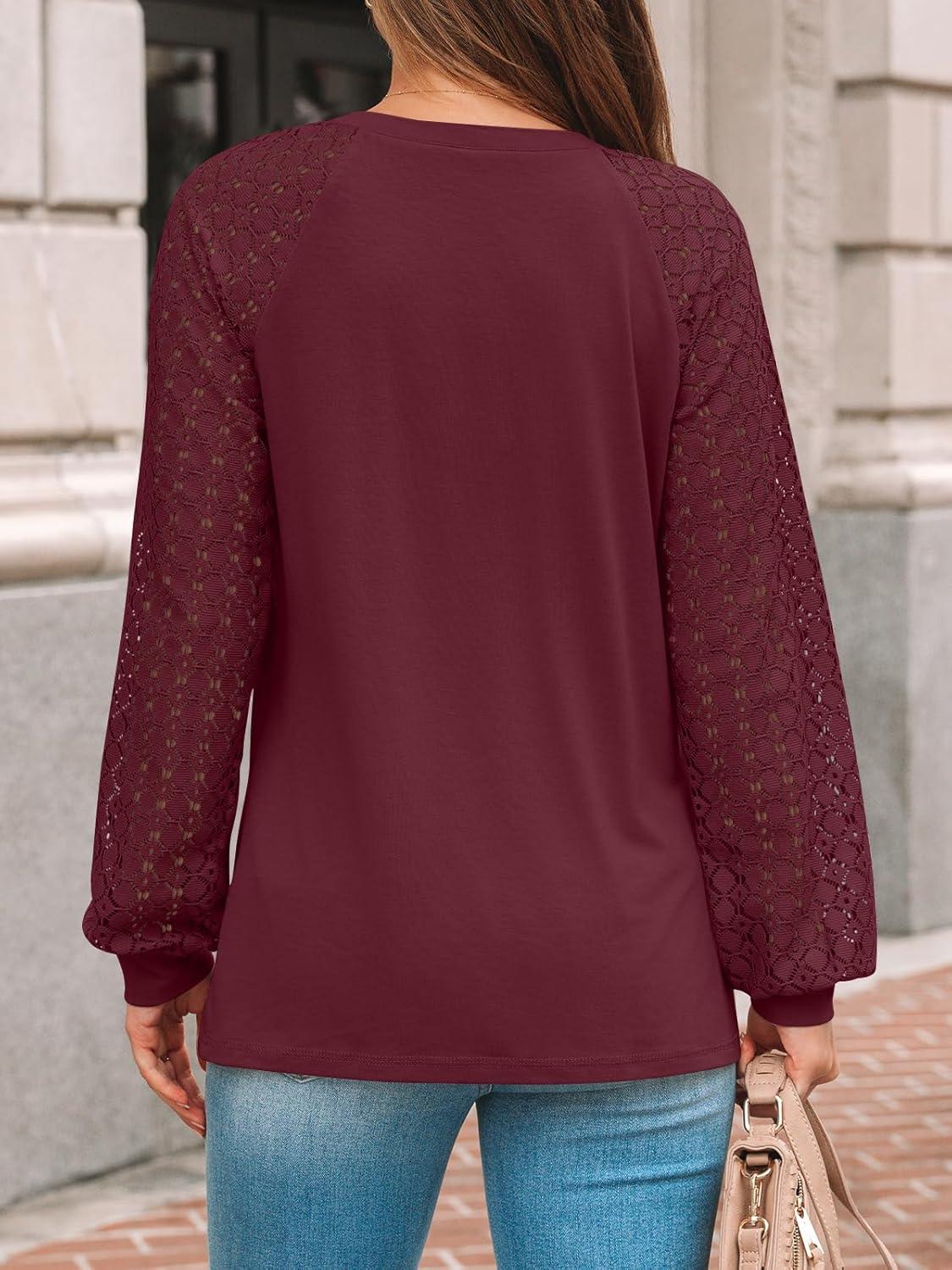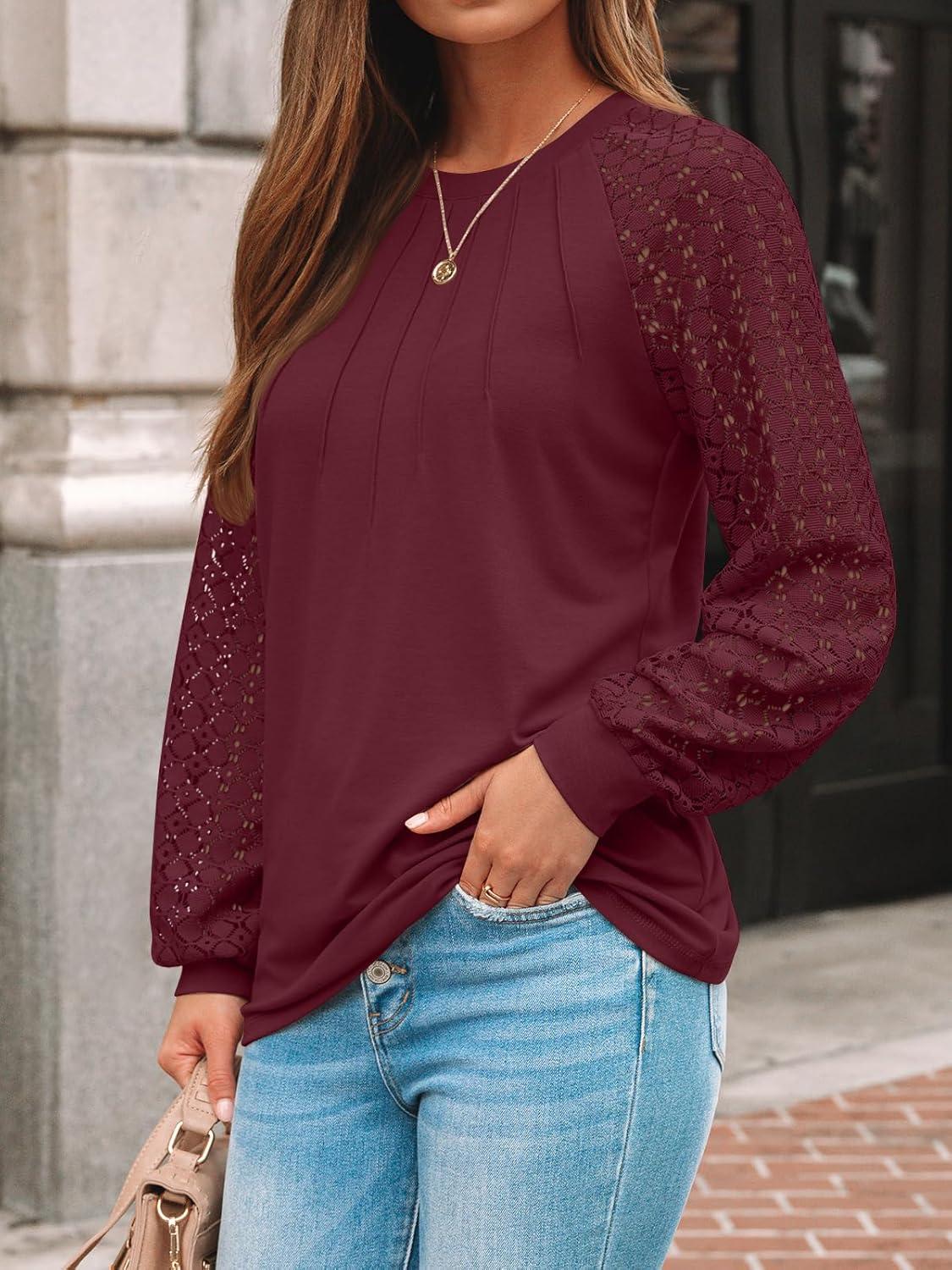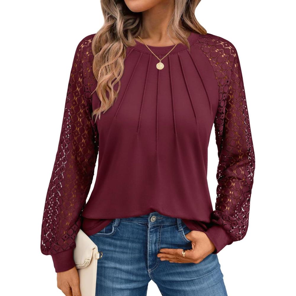 AUTOMET Womens Long Sleeve Shirts Pleated Lace Tops Fall Fashion Outfits Business Casual Blouses(Red)