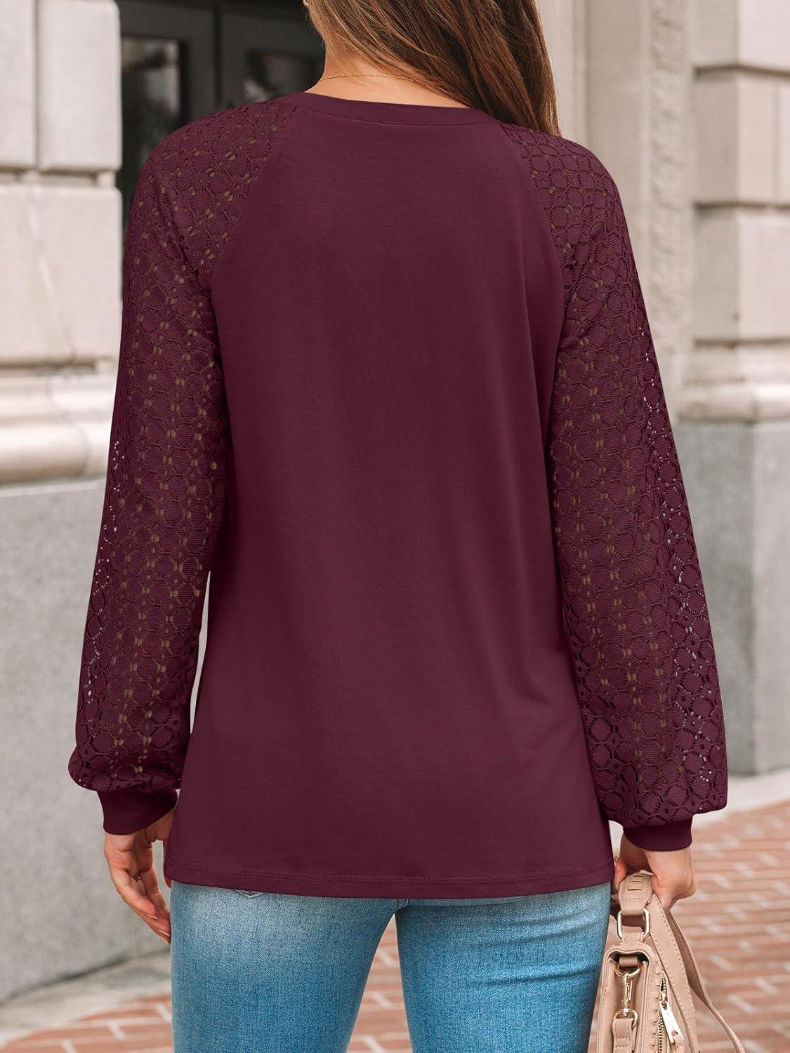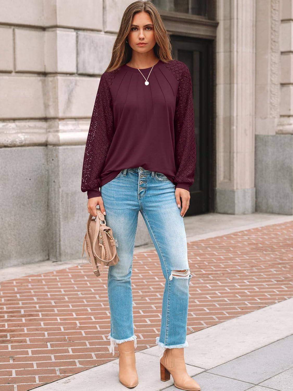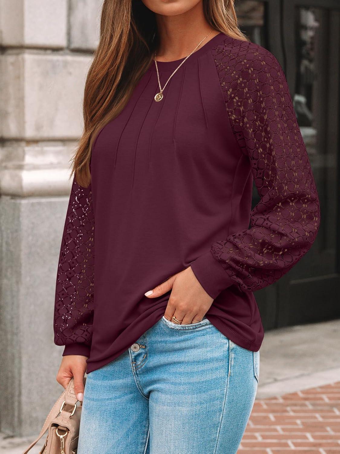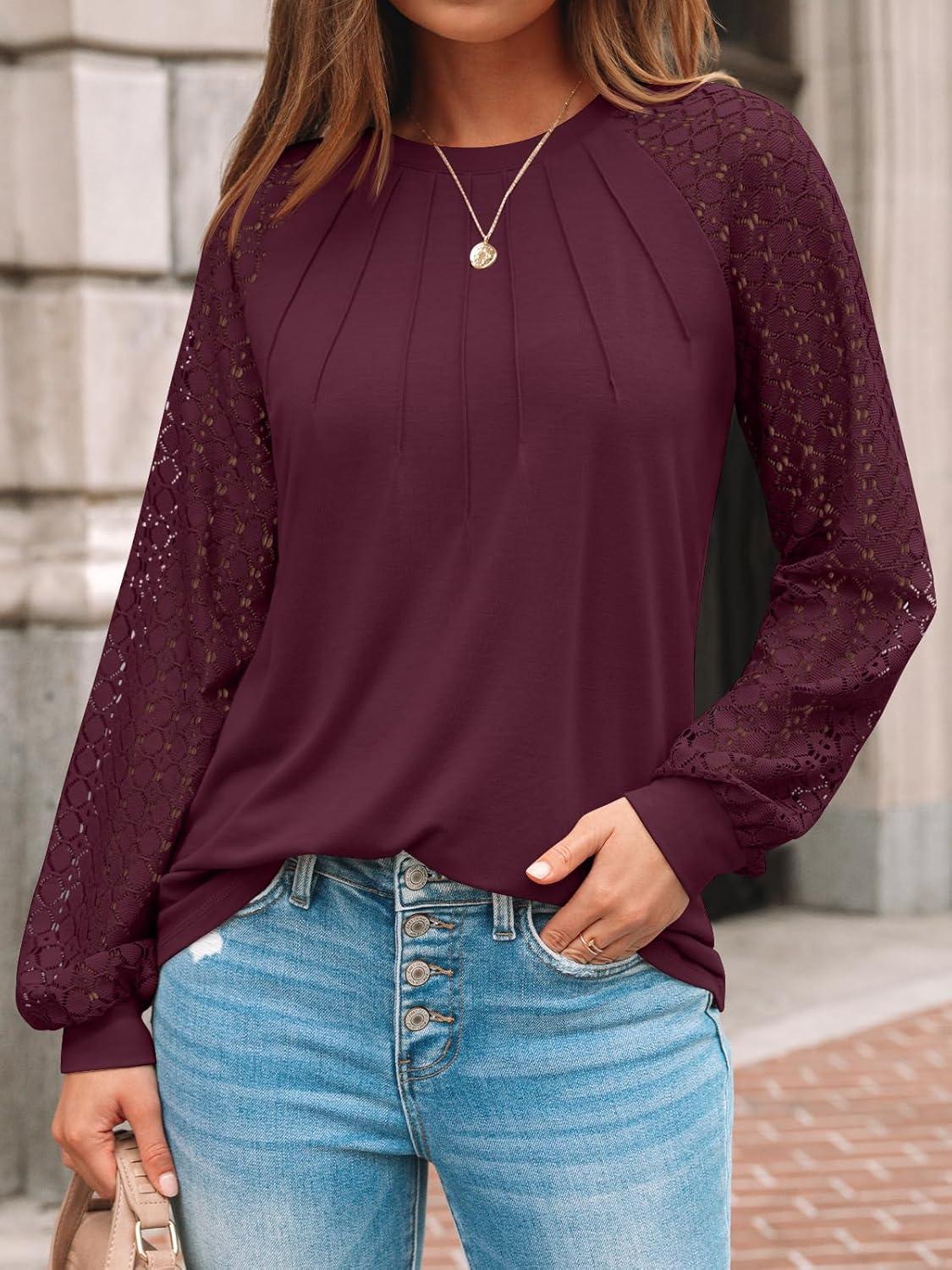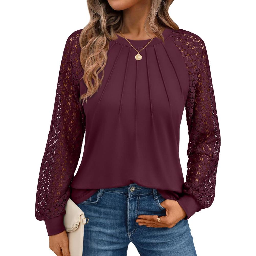 AUTOMET Womens Long Sleeve Shirts Pleated Lace Tops Fall Fashion Outfits Business Casual Blouses(Wine)