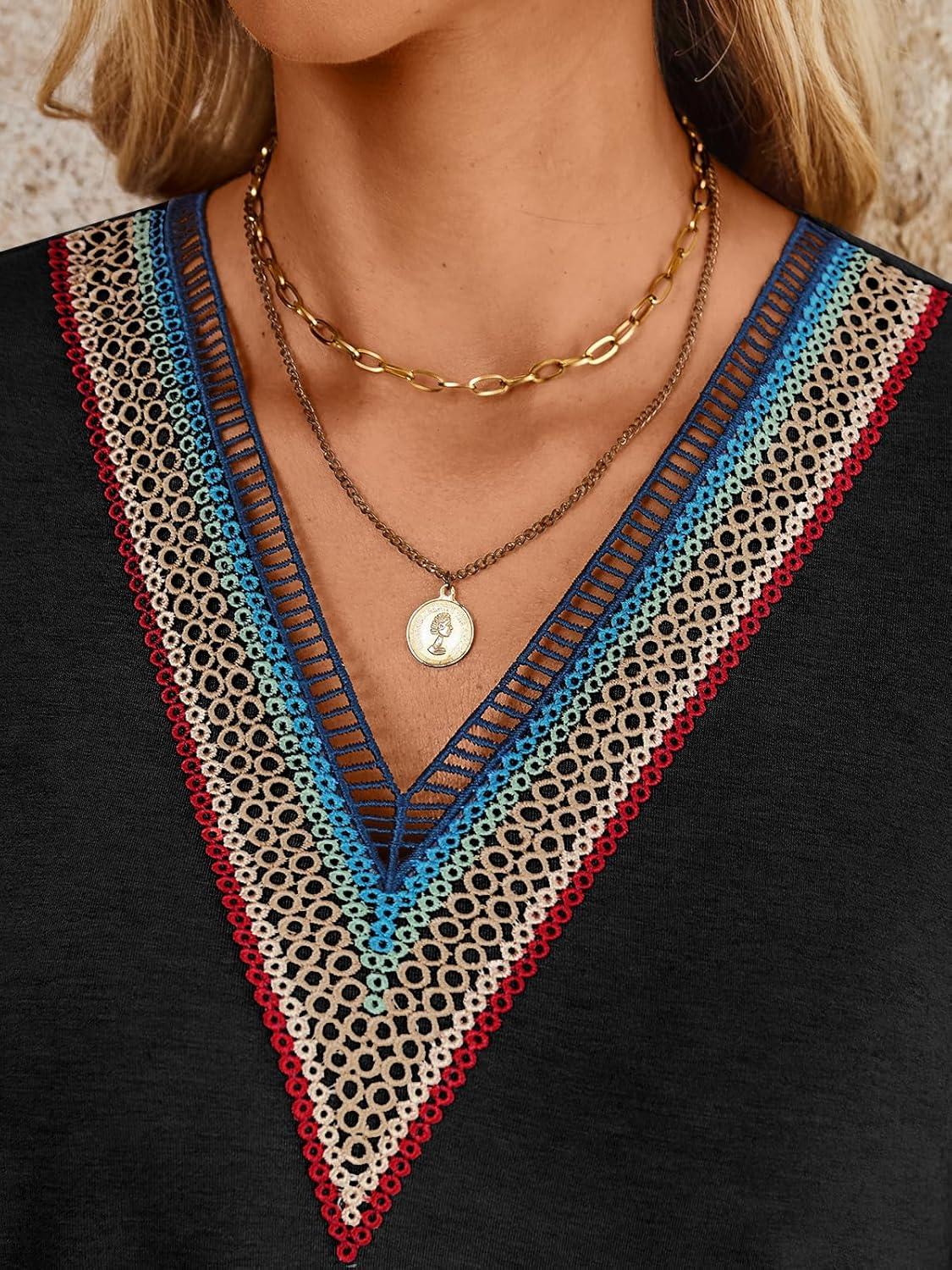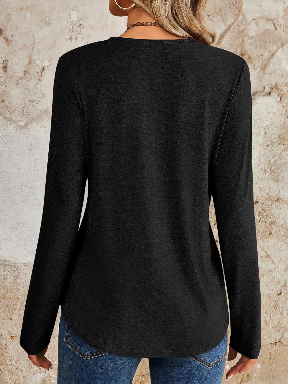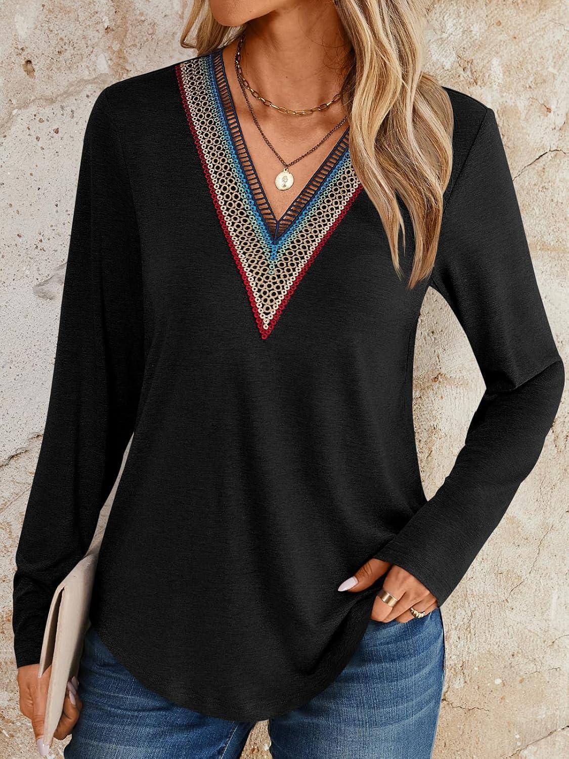 AUTOMET Womens Long Sleeve Tops Lace V Neck Shirts Casual Boho Top Fall Fashion Blouses 2025 Trendy Soft Basic Clothes(Black)