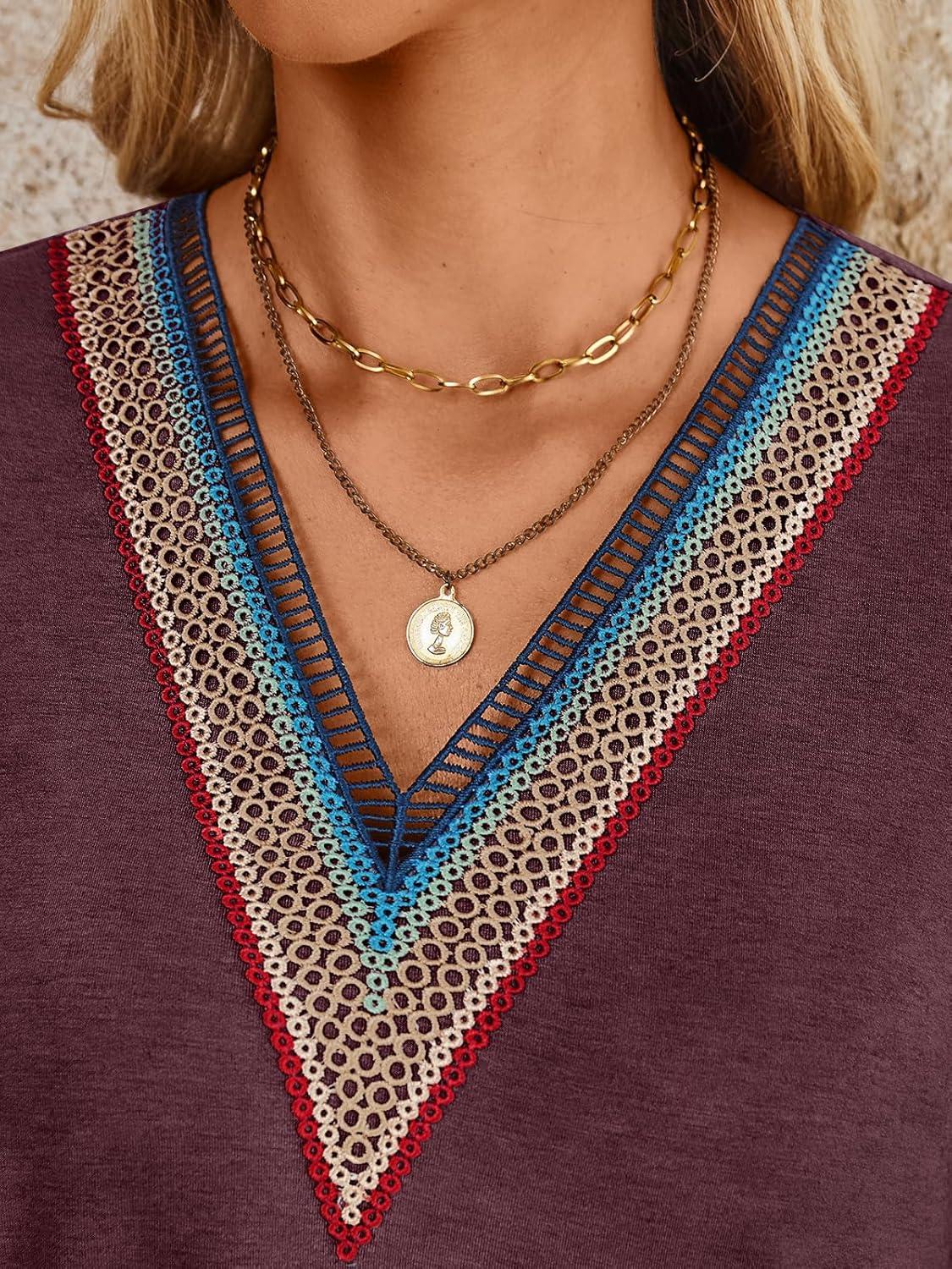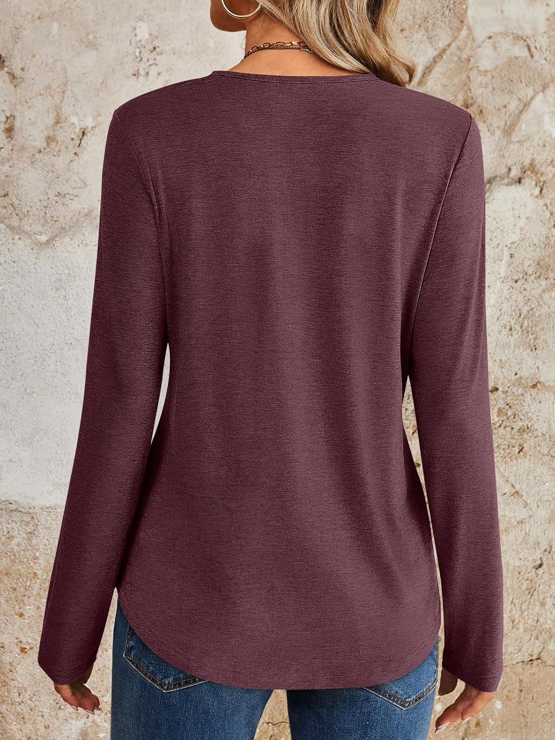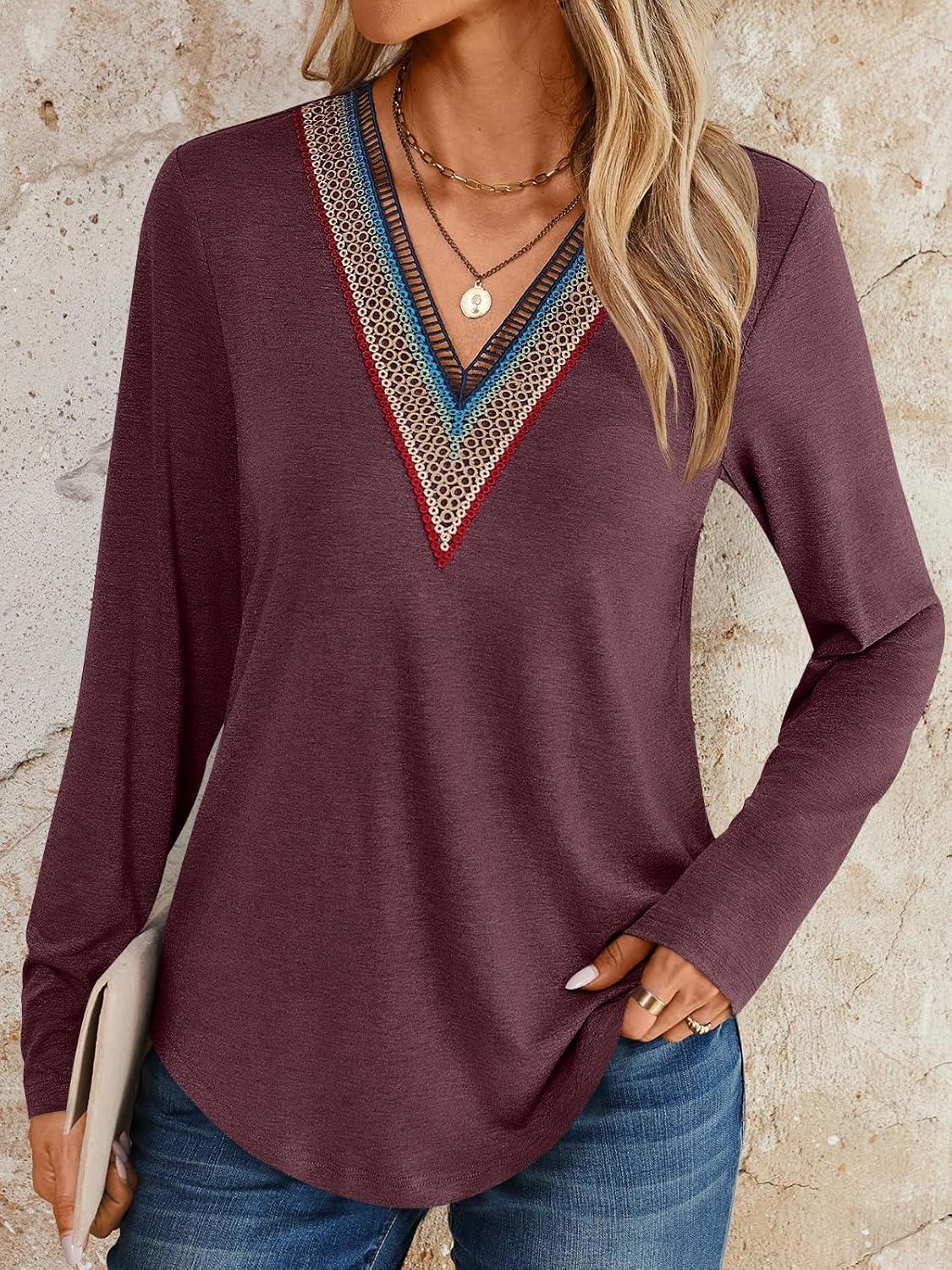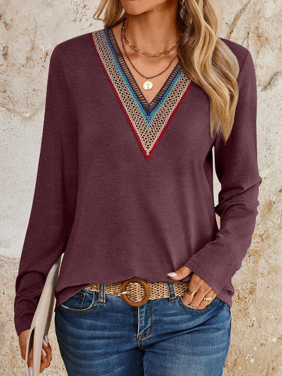 AUTOMET Womens Long Sleeve Tops Lace V Neck Shirts Casual Boho Top Fall Fashion Blouses 2025 Trendy Soft Basic Clothes(Winered)