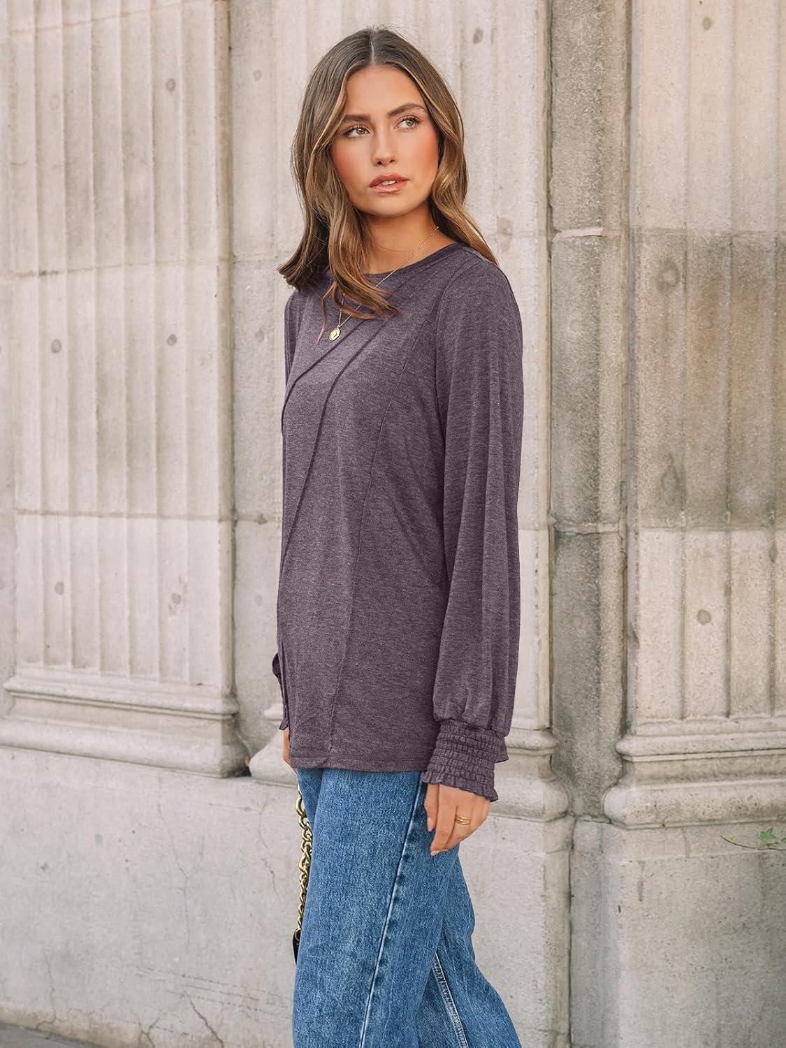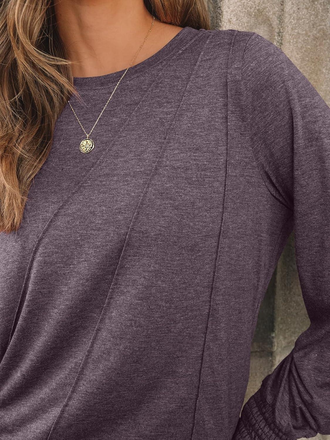 AUTOMET Womens Long Sleeve Tops Pleated Crew Neck Business Casual Blouses Fashion Clothes 2025 Trendy Outfits(Rose Taupe)
