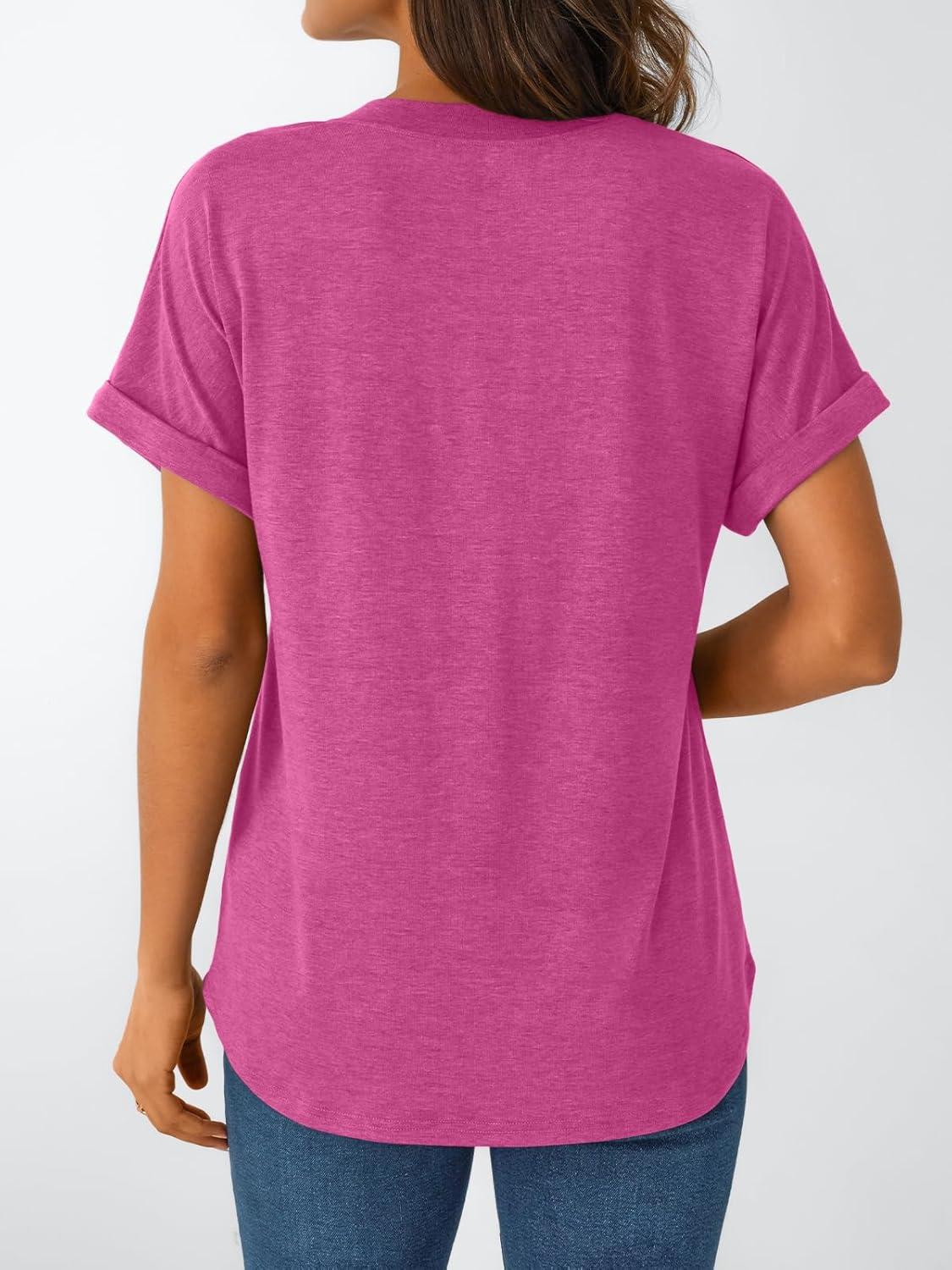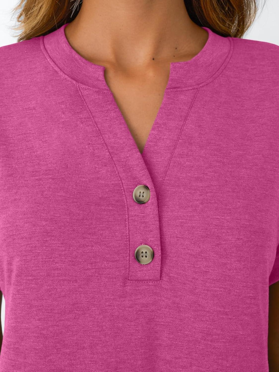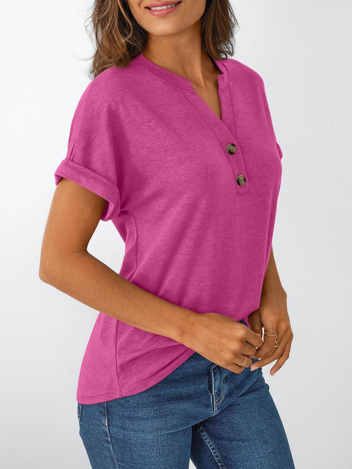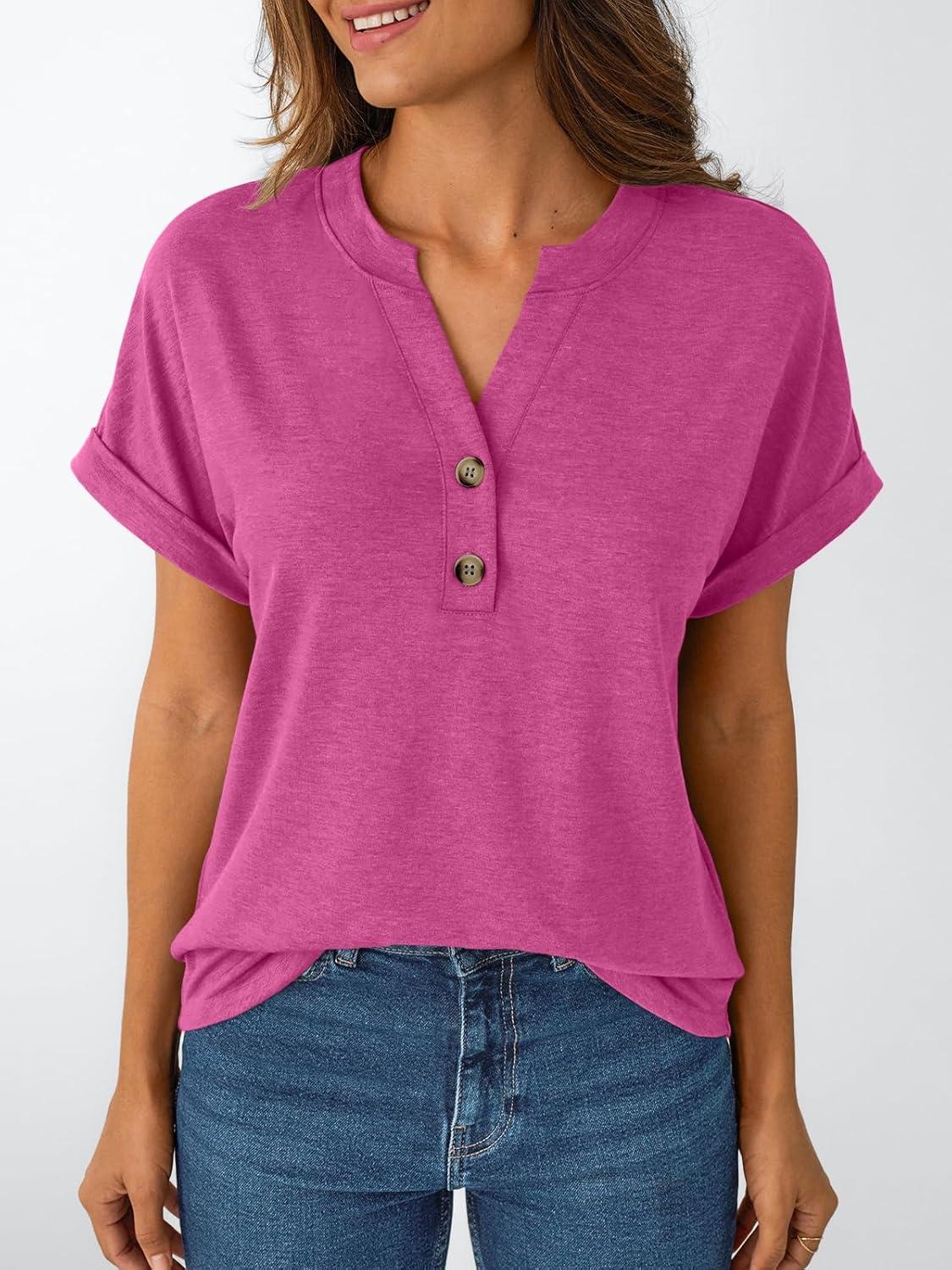 AUTOMET Women’s Short Sleeve Shirts Henley Dressy Casual Summer Tops 2026 Spring Fashion Trendy Cute T-Shirts(Rose)