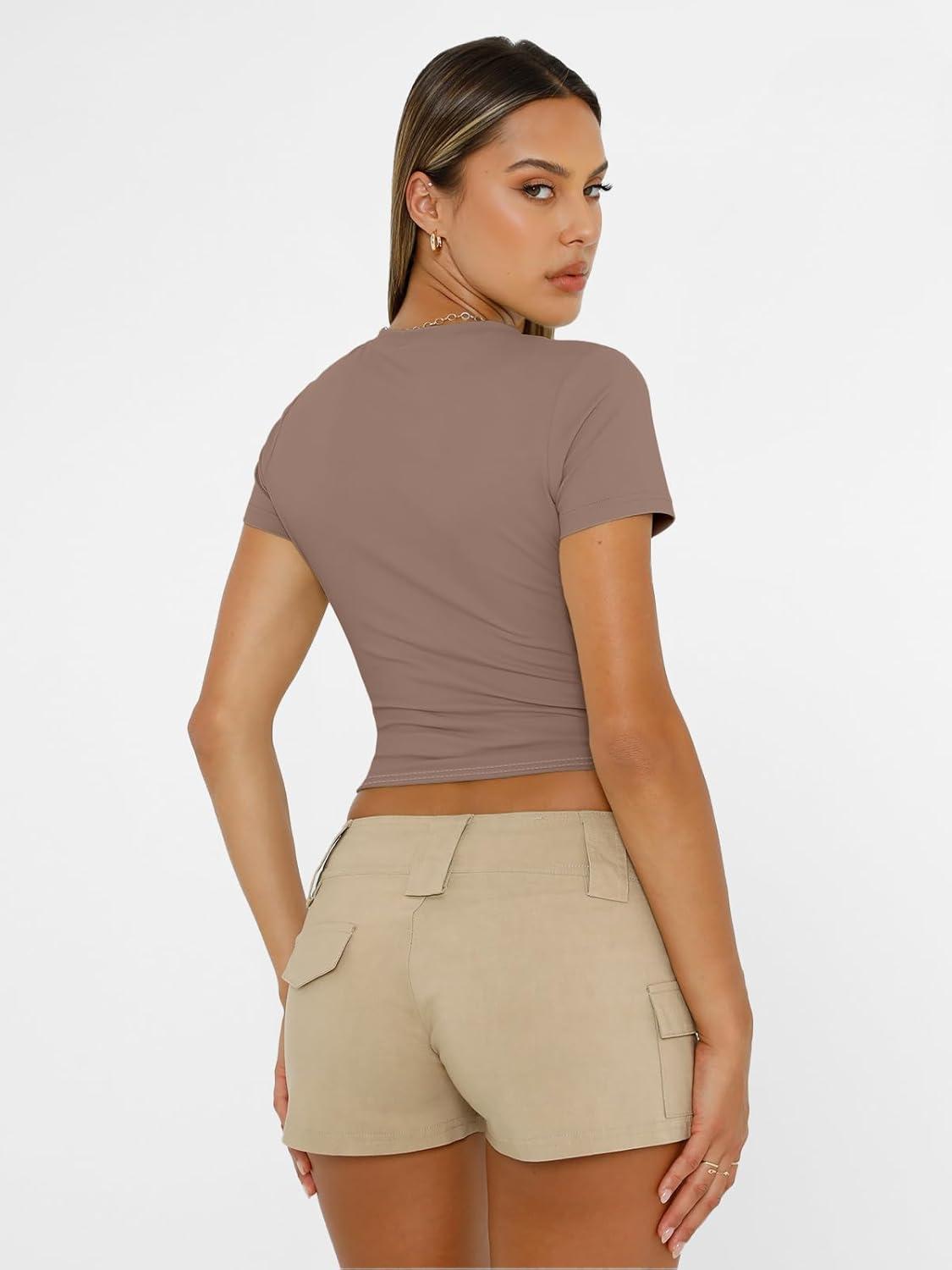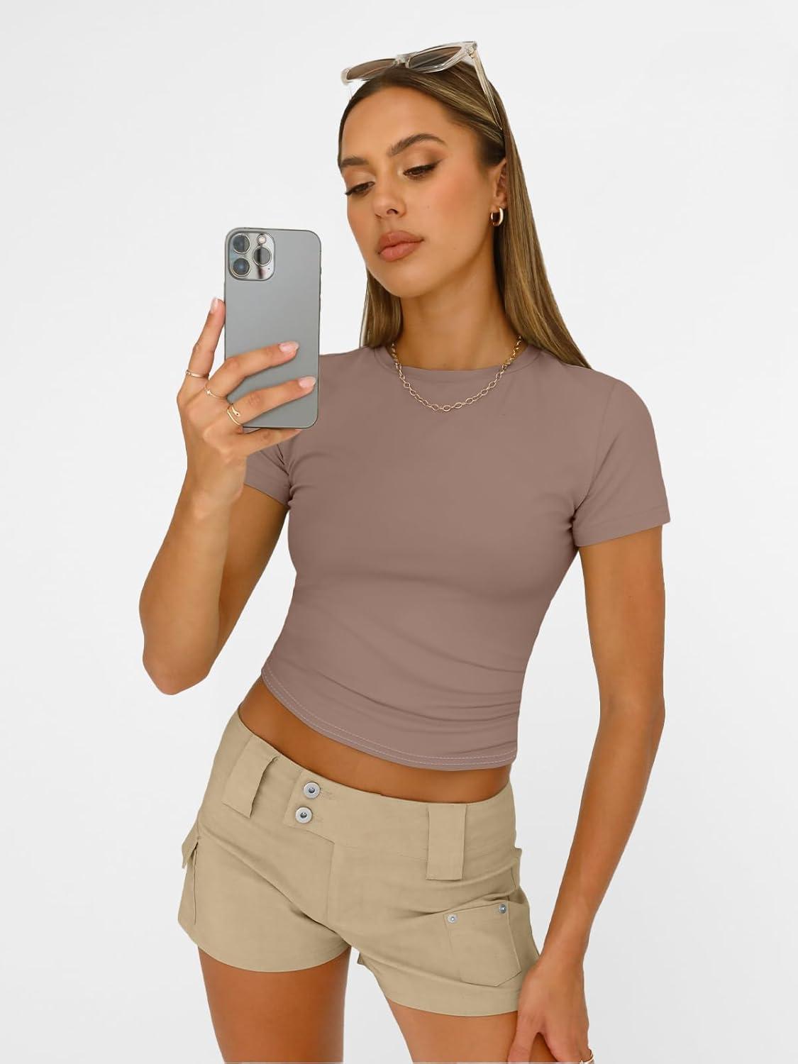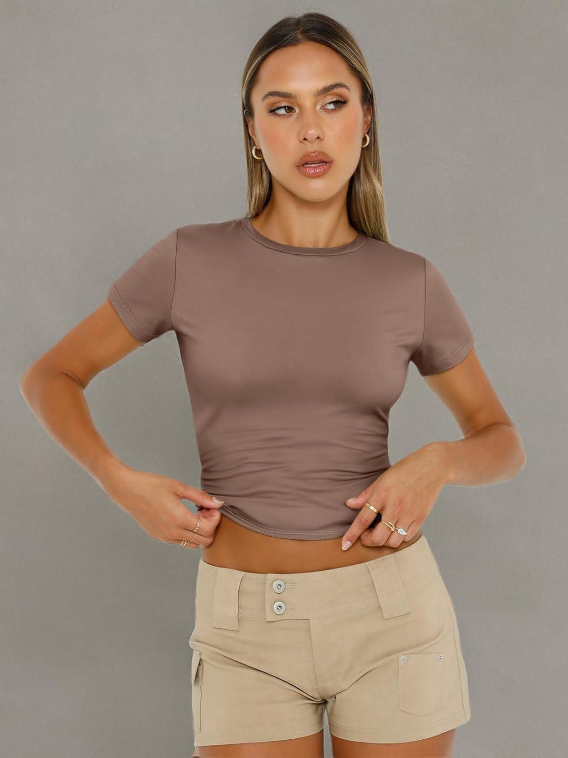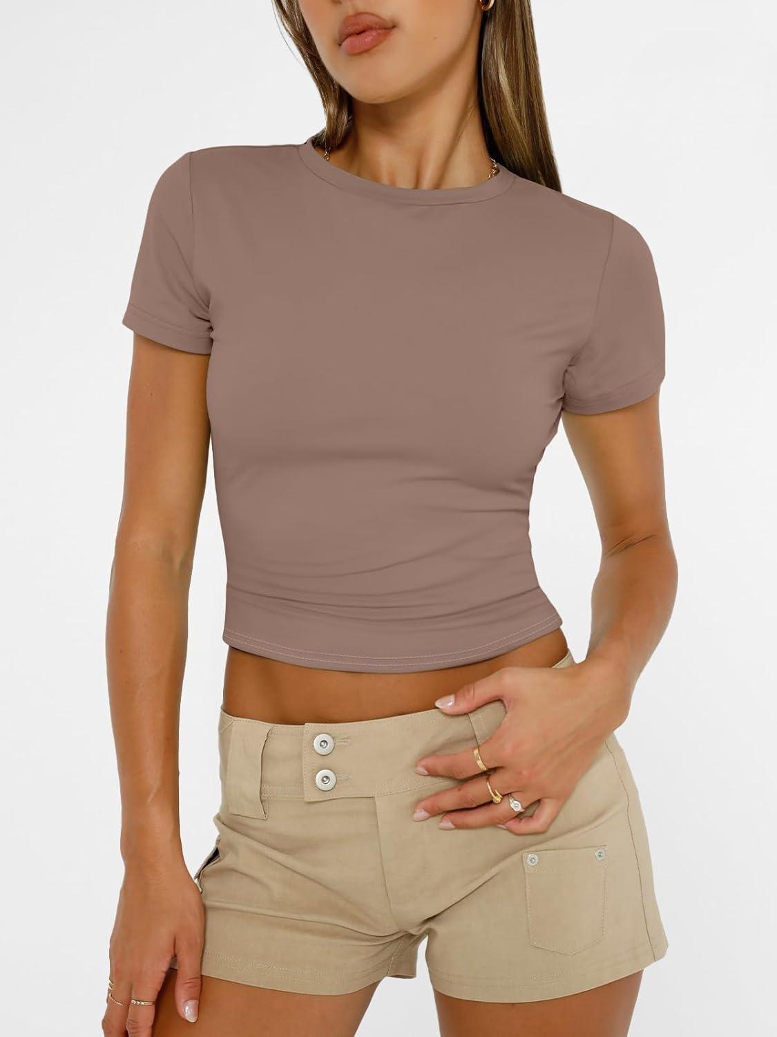 AUTOMET Womens Short Sleeve T Shirts Basic Summer 2025 Workout Tops Crew Neck Gym Crop Tops Trendy Y2K Clothes(Coffee Grey)