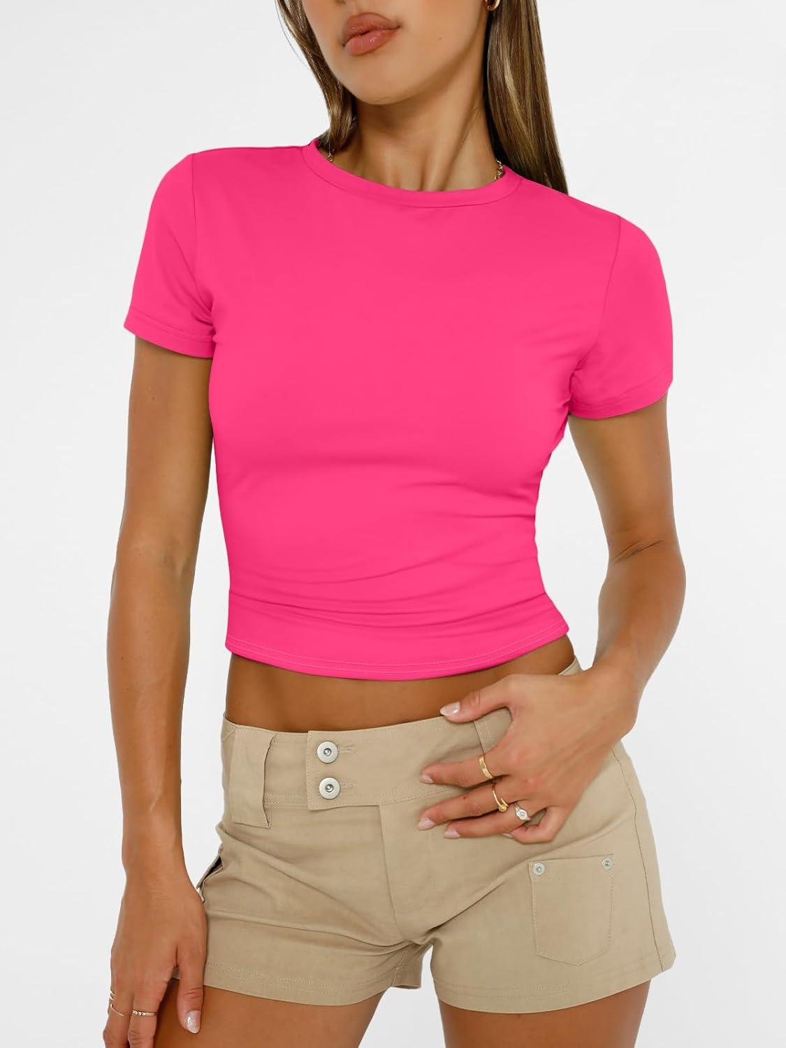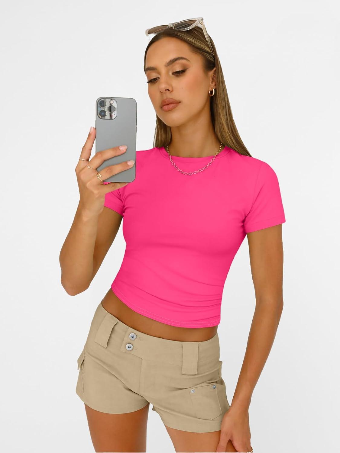 AUTOMET Womens Short Sleeve T Shirts Basic Summer 2025 Workout Tops Crew Neck Gym Crop Tops Trendy Y2K Clothes(Neonpink)