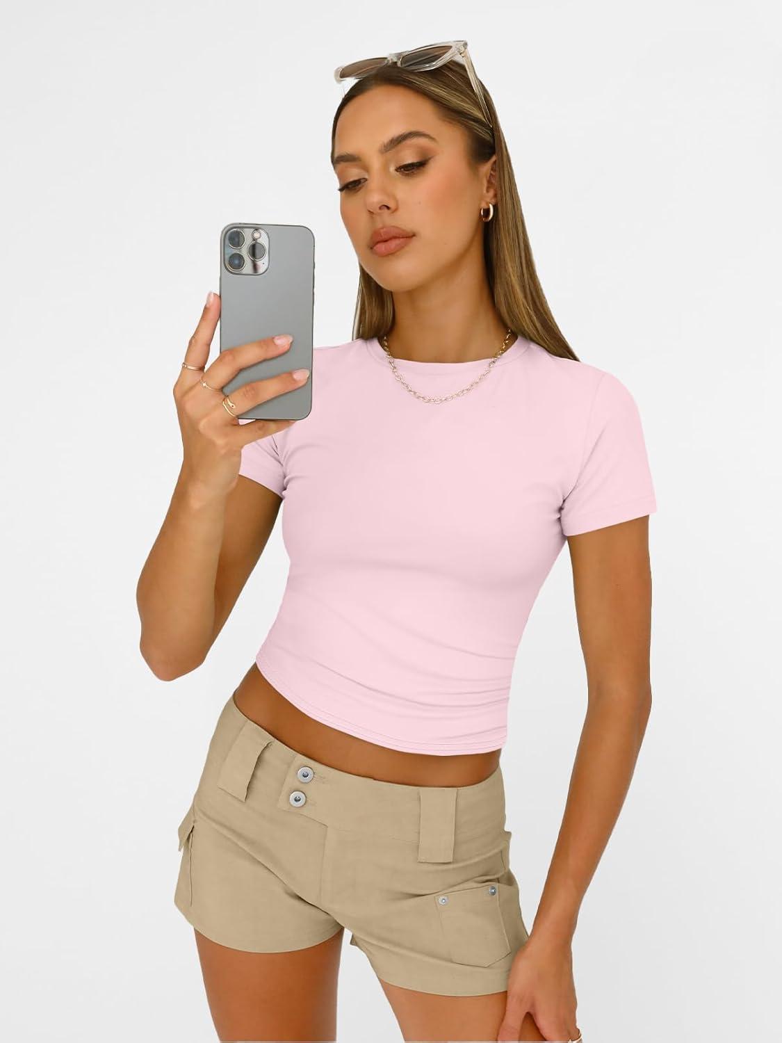 AUTOMET Womens Short Sleeve T Shirts Basic Summer 2025 Workout Tops Crew Neck Gym Crop Tops Trendy Y2K Clothes(Pink)