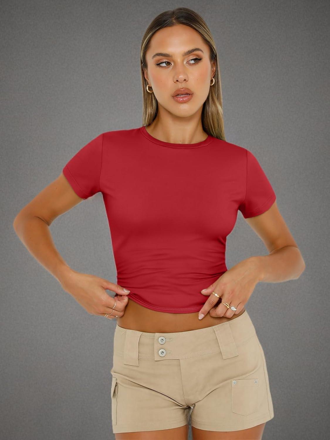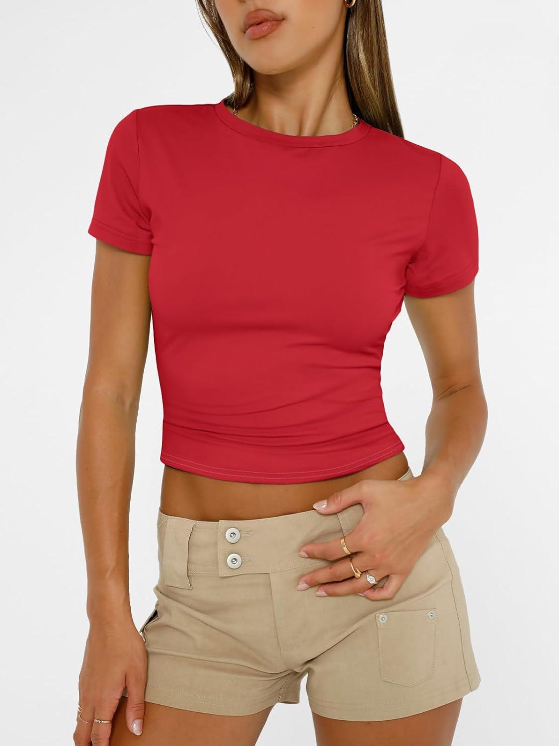 AUTOMET Womens Short Sleeve T Shirts Basic Summer 2025 Workout Tops Crew Neck Gym Crop Tops Trendy Y2K Clothes(Red)