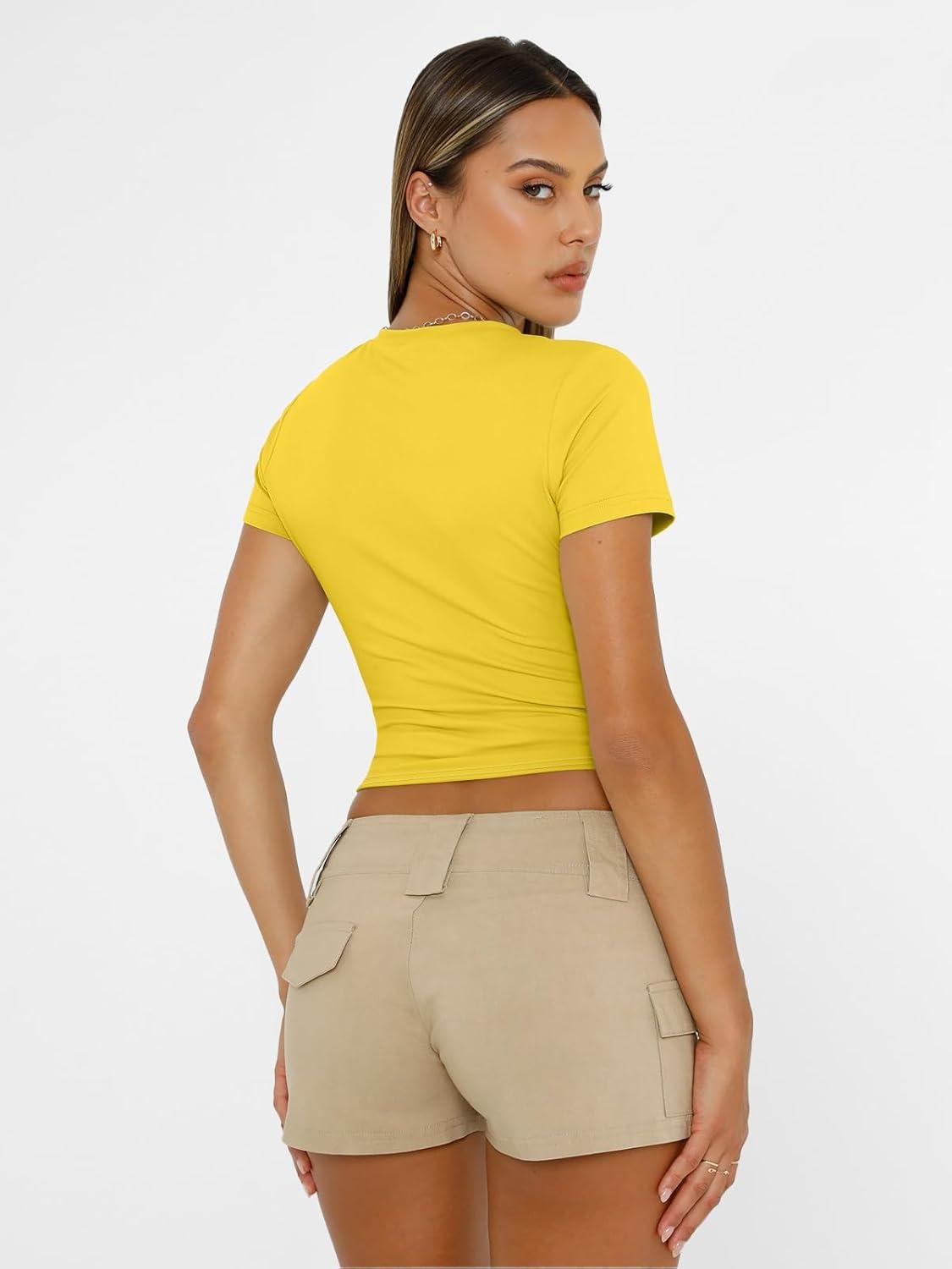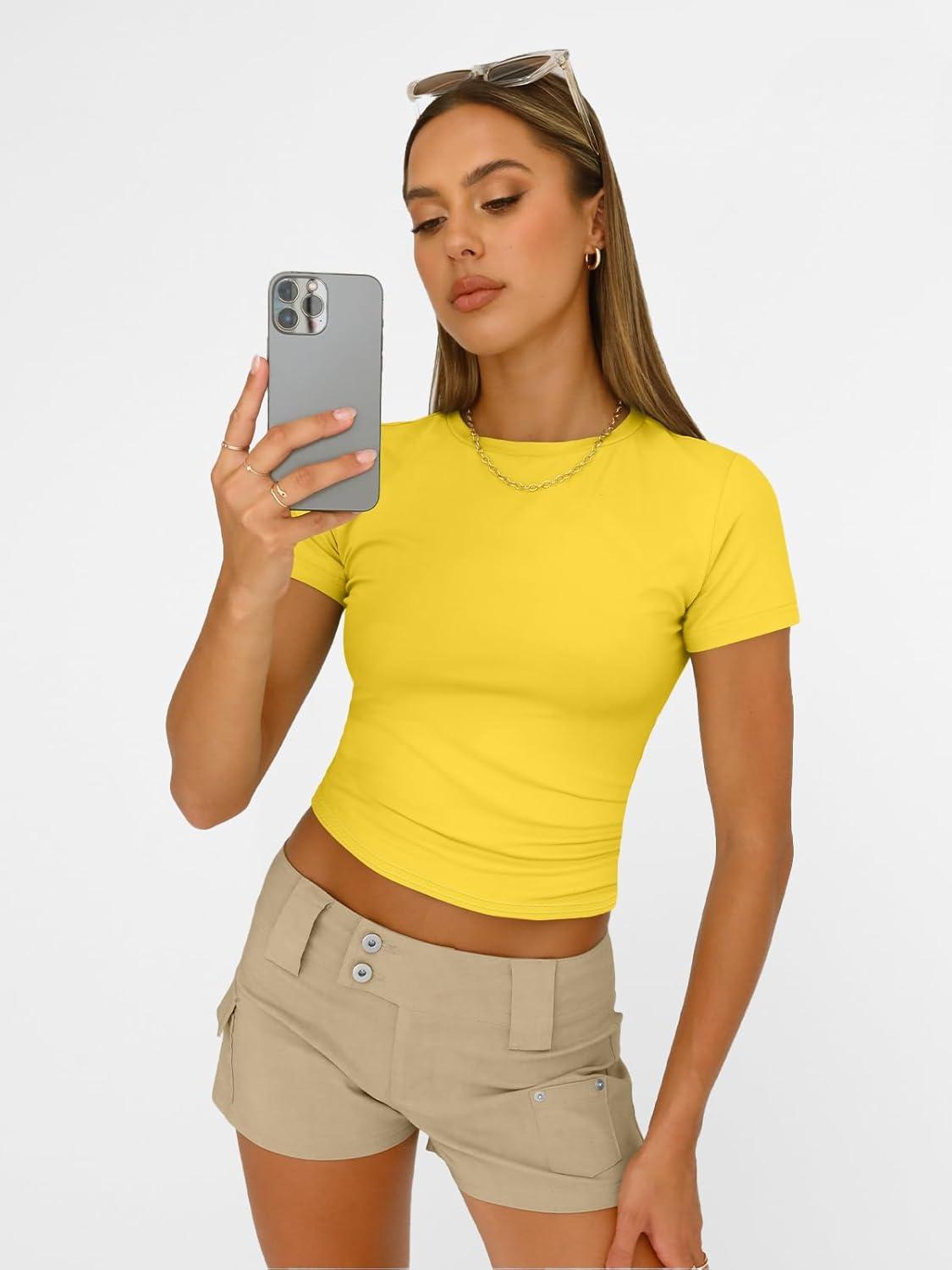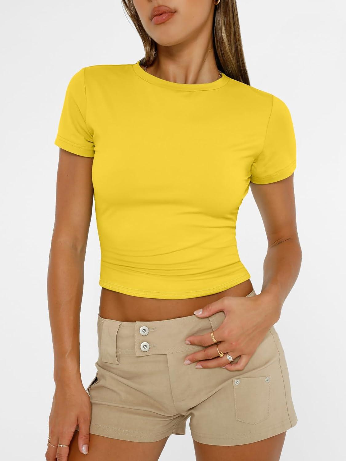 AUTOMET Womens Short Sleeve T Shirts Basic Summer 2025 Workout Tops Crew Neck Gym Crop Tops Trendy Y2K Clothes(Yellow)