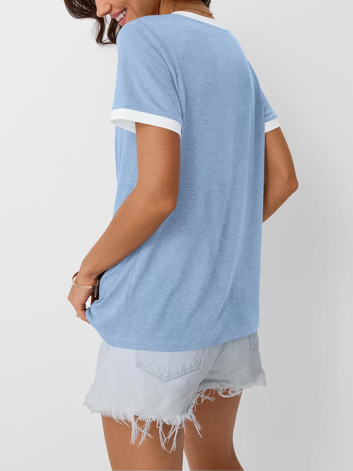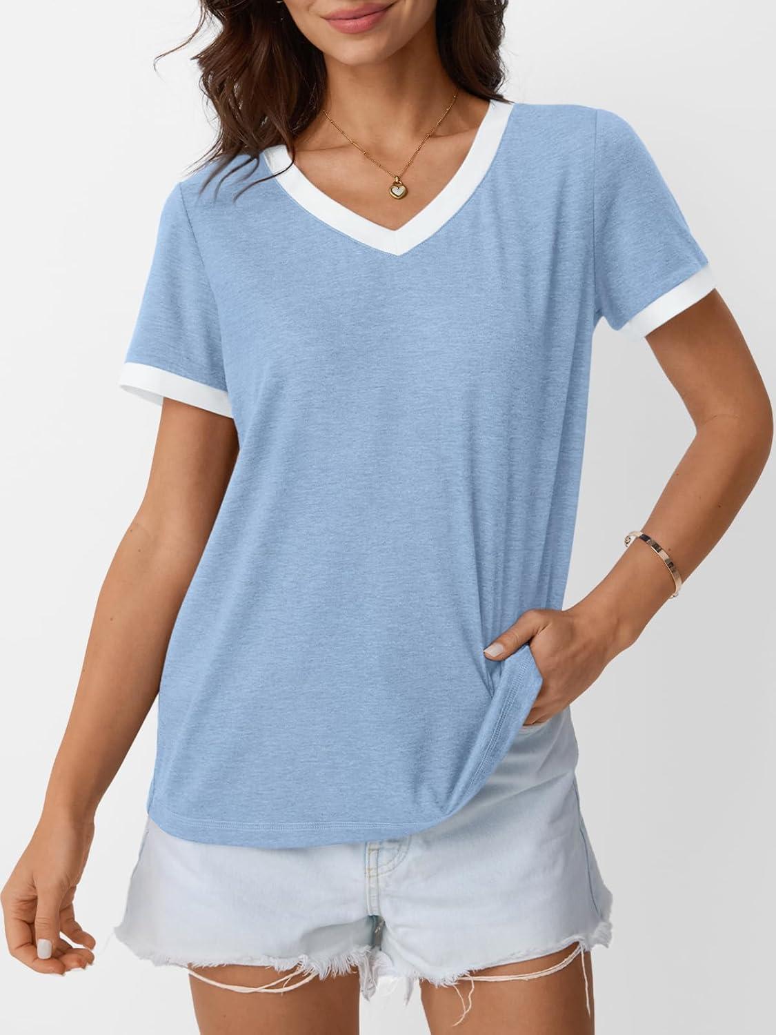 AUTOMET Womens Short Sleeve T-Shirts Summer Tops Casual Soft Tunic V Neck Basic Workout Clothes Spring Fashion Outfits 2025(Blue)