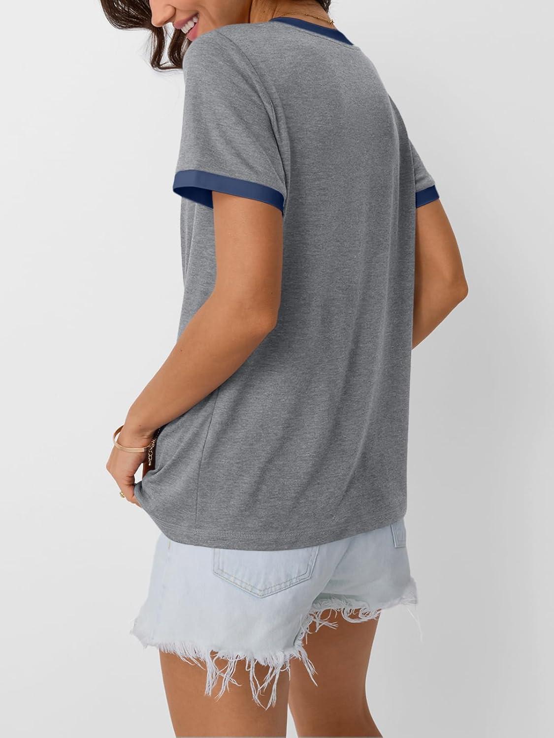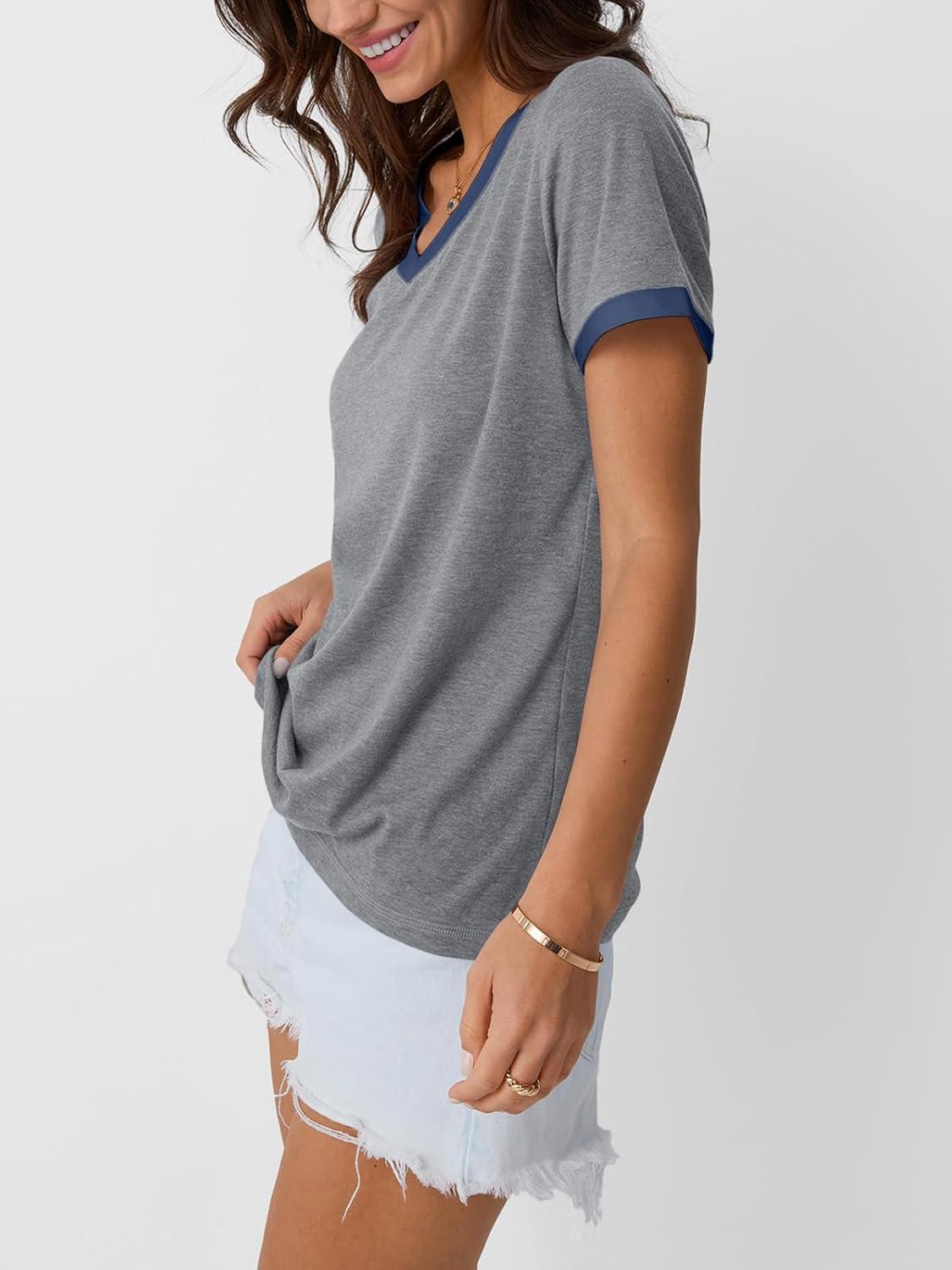 AUTOMET Womens Short Sleeve T-Shirts Summer Tops Casual Soft Tunic V Neck Basic Workout Clothes Spring Fashion Outfits 2025(Bluegrey)