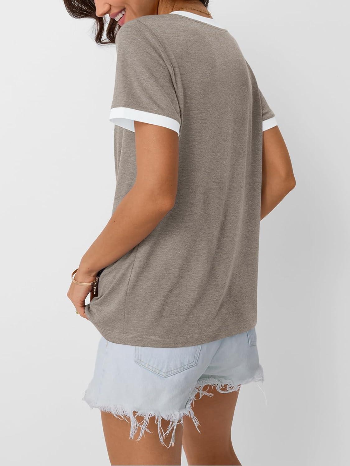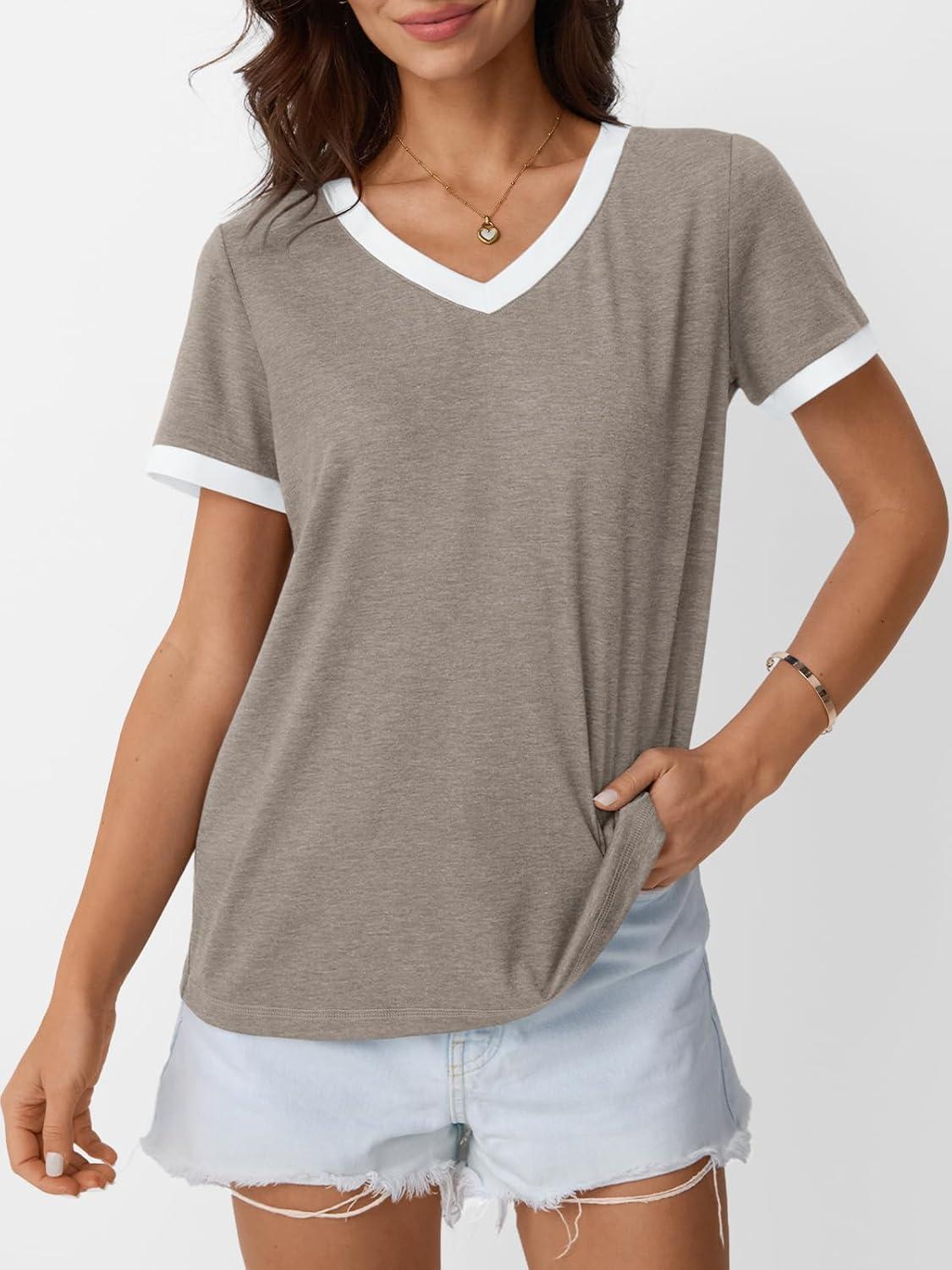 AUTOMET Womens Short Sleeve T-Shirts Summer Tops Casual Soft Tunic V Neck Basic Workout Clothes Spring Fashion Outfits 2025(Coffeegrey)
