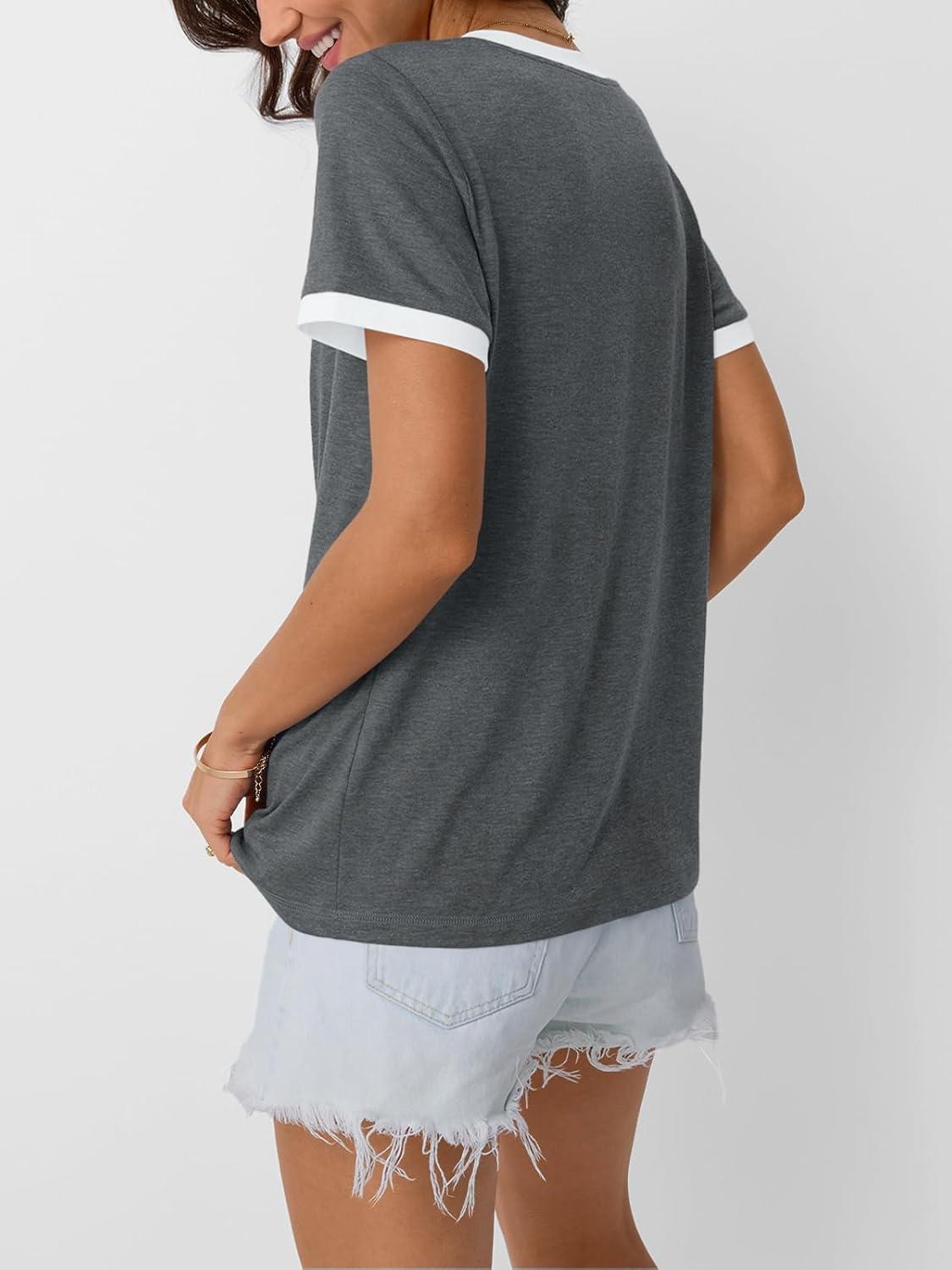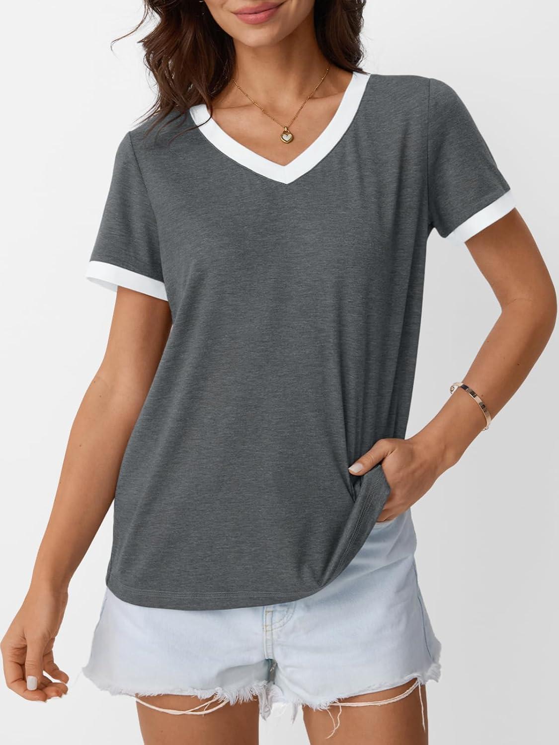 AUTOMET Womens Short Sleeve T-Shirts Summer Tops Casual Soft Tunic V Neck Basic Workout Clothes Spring Fashion Outfits 2025(Grey)