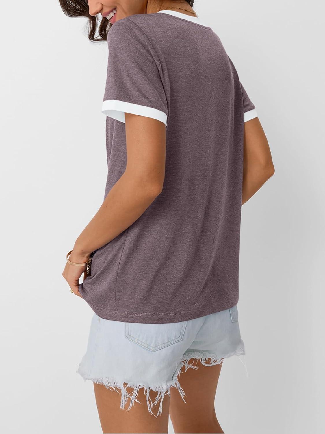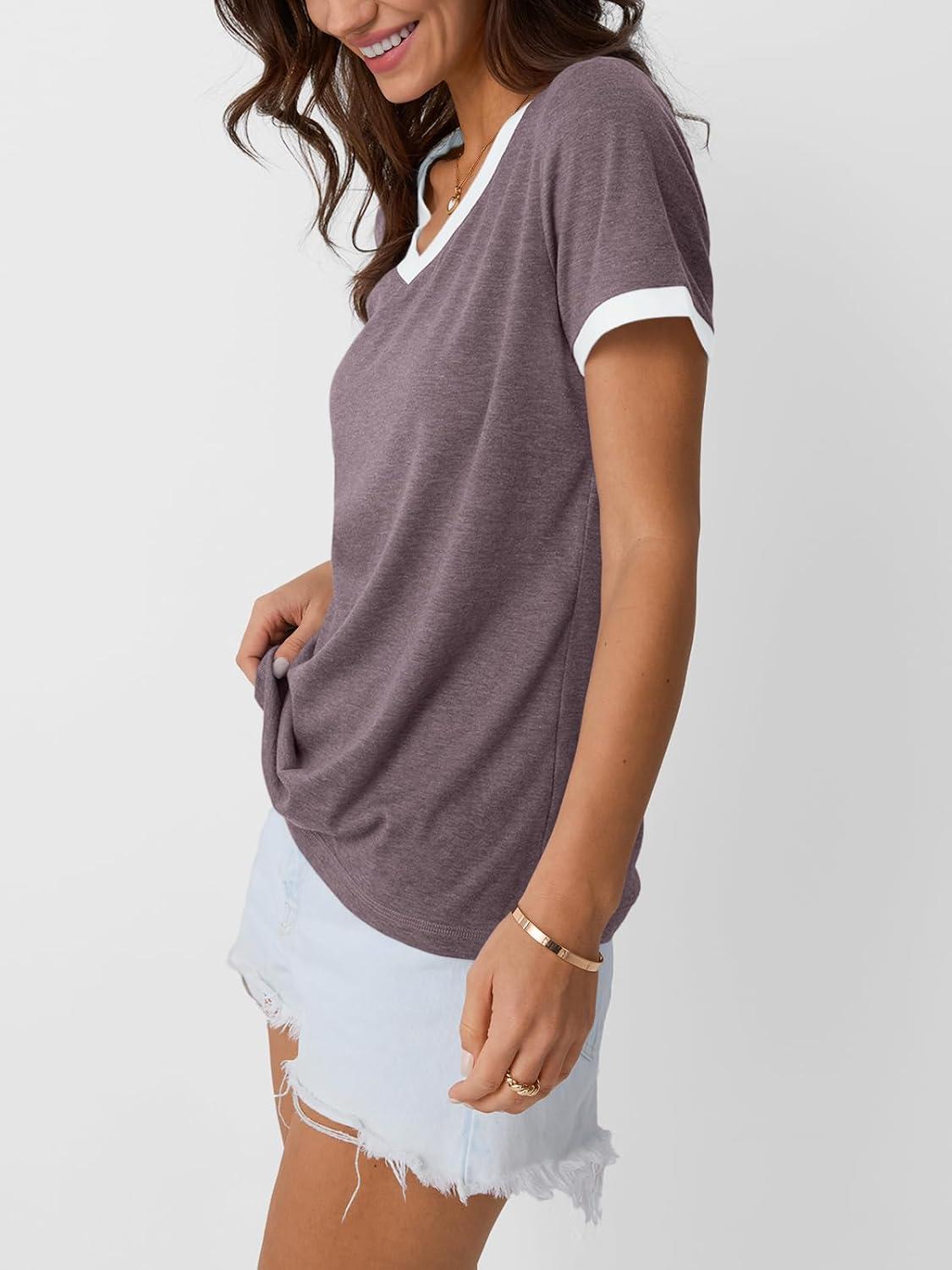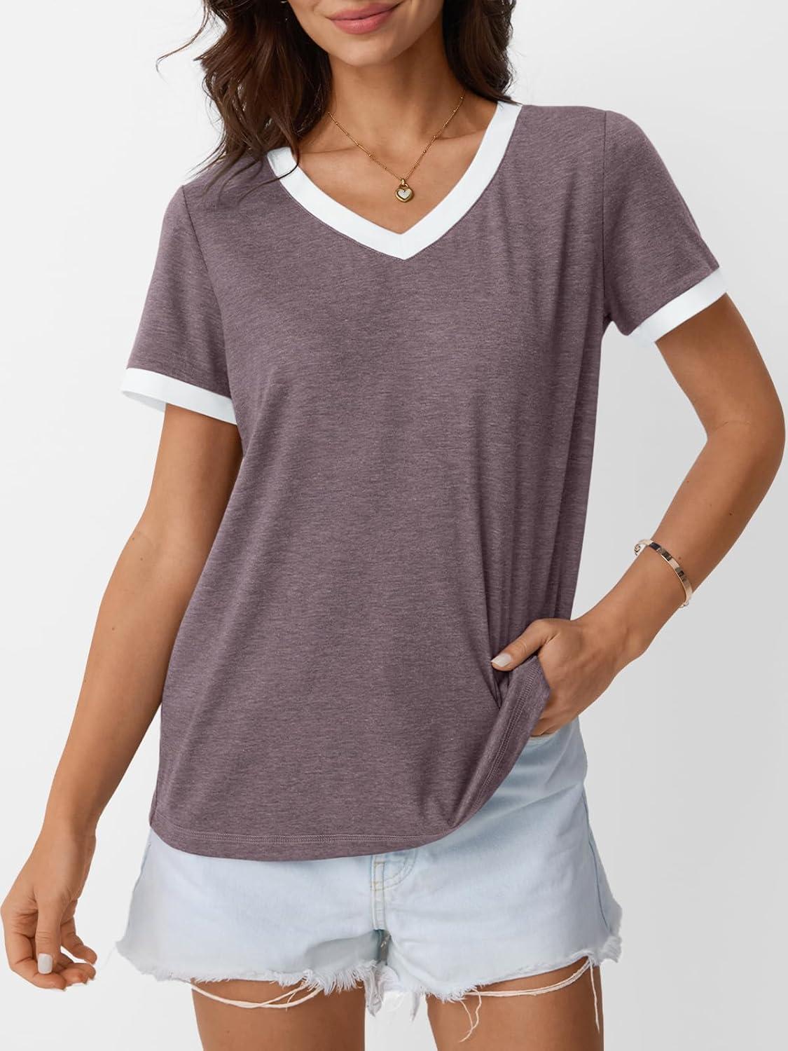 AUTOMET Womens Short Sleeve T-Shirts Summer Tops Casual Soft Tunic V Neck Basic Workout Clothes Spring Fashion Outfits 2025(Purplegrey)