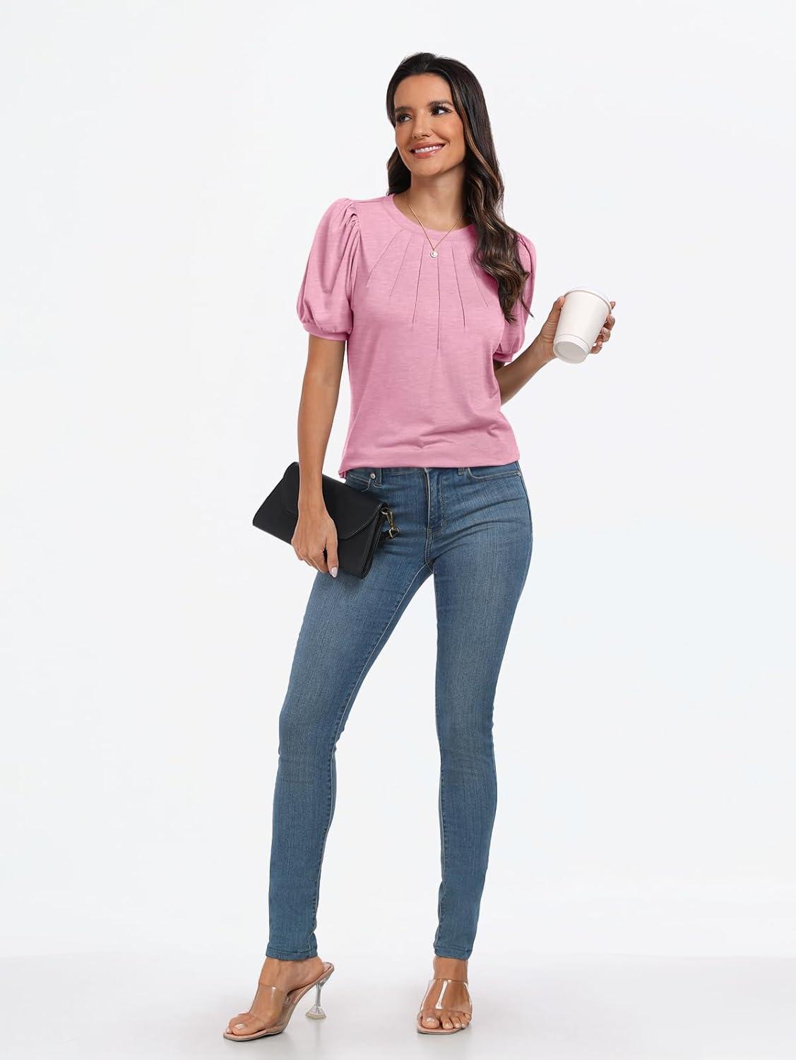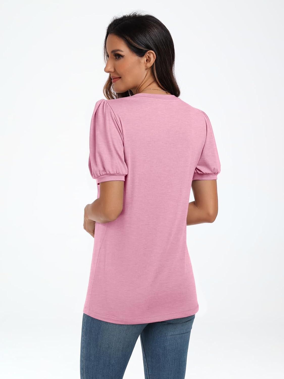 AUTOMET Womens Summer Tops Short Sleeve Shirts Business Casual Outfits Puff Dressy Blouses Spring Clothes 2025(Pink)