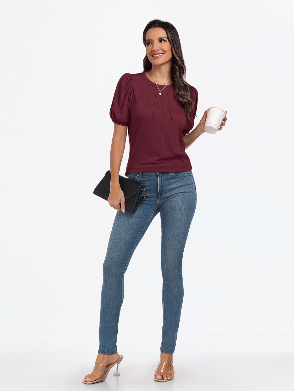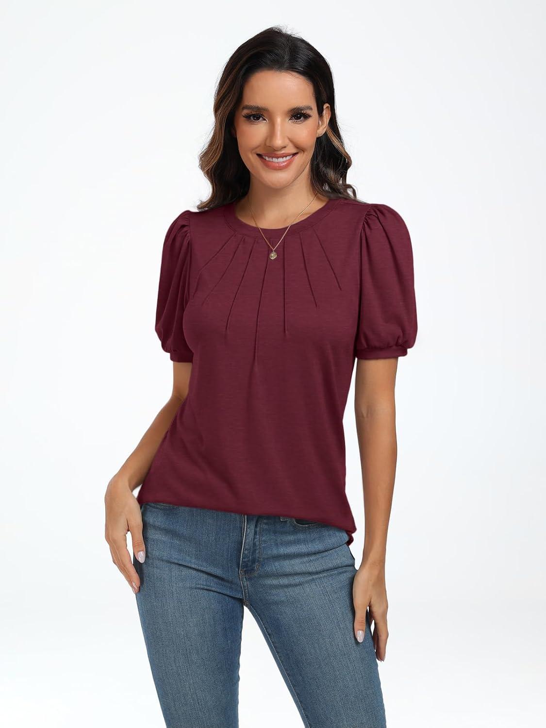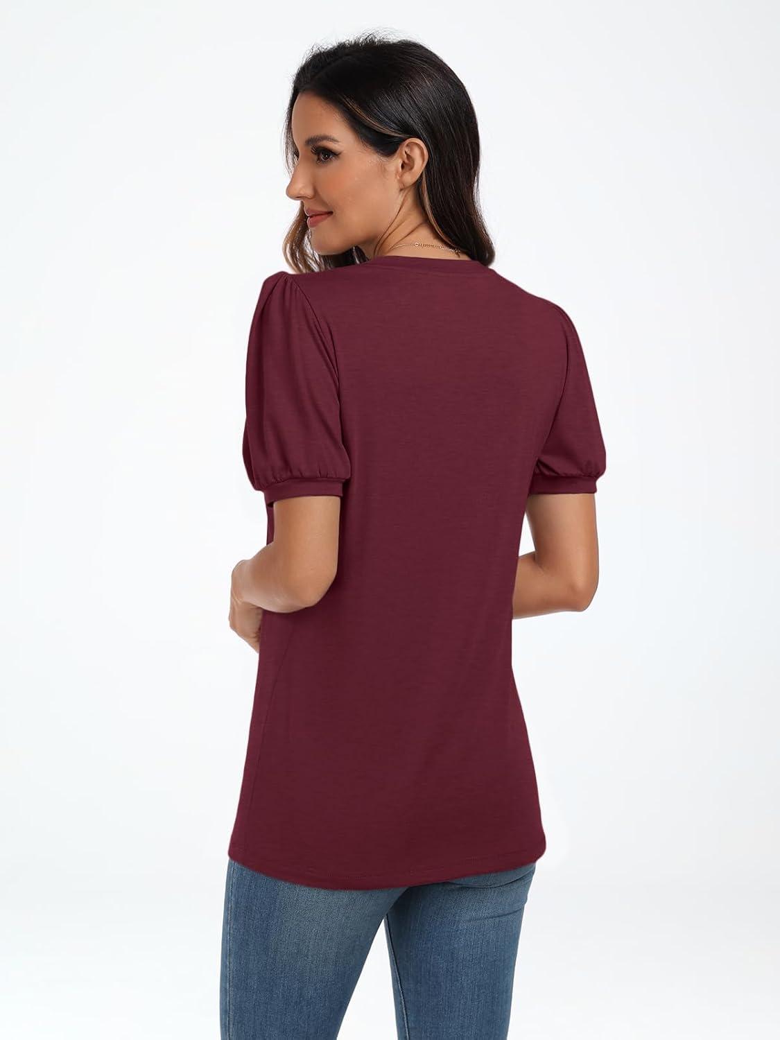 AUTOMET Womens Summer Tops Short Sleeve Shirts Business Casual Outfits Puff Dressy Blouses Spring Clothes 2025(Winered)