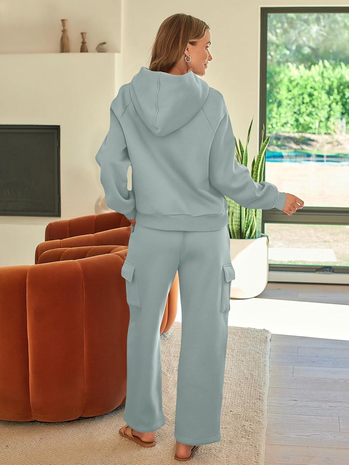 AUTOMET Womens Sweatsuits 2 Piece Outfits Fall Sweat Sets Lounge Hoodies and Cargo Pants Wide Leg with Pockets(Bluegreen)