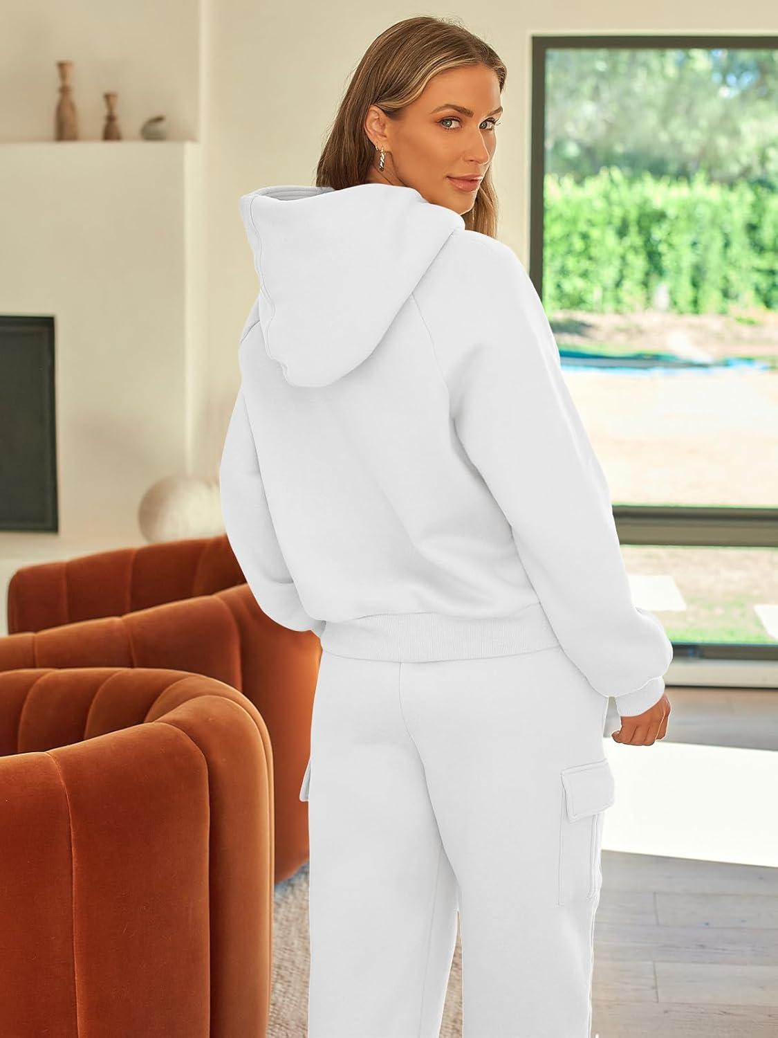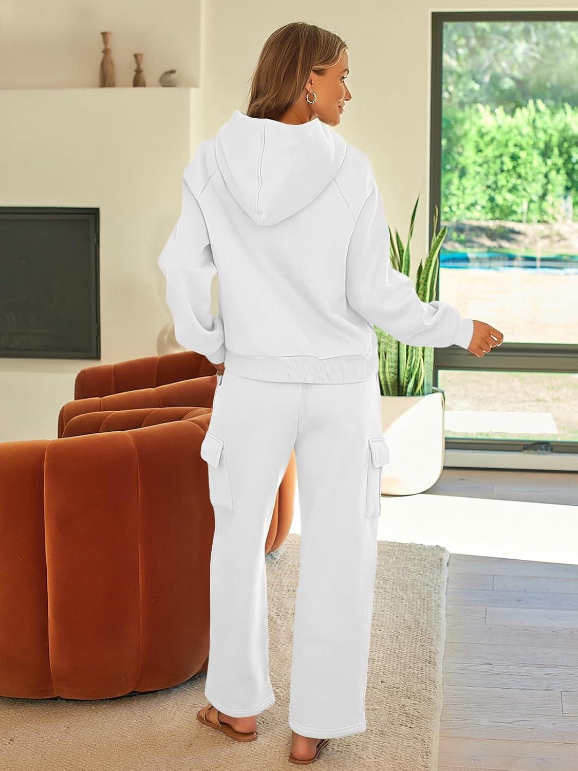 AUTOMET Womens Sweatsuits 2 Piece Outfits Fall Sweat Sets Lounge Hoodies and Cargo Pants Wide Leg with Pockets(White)