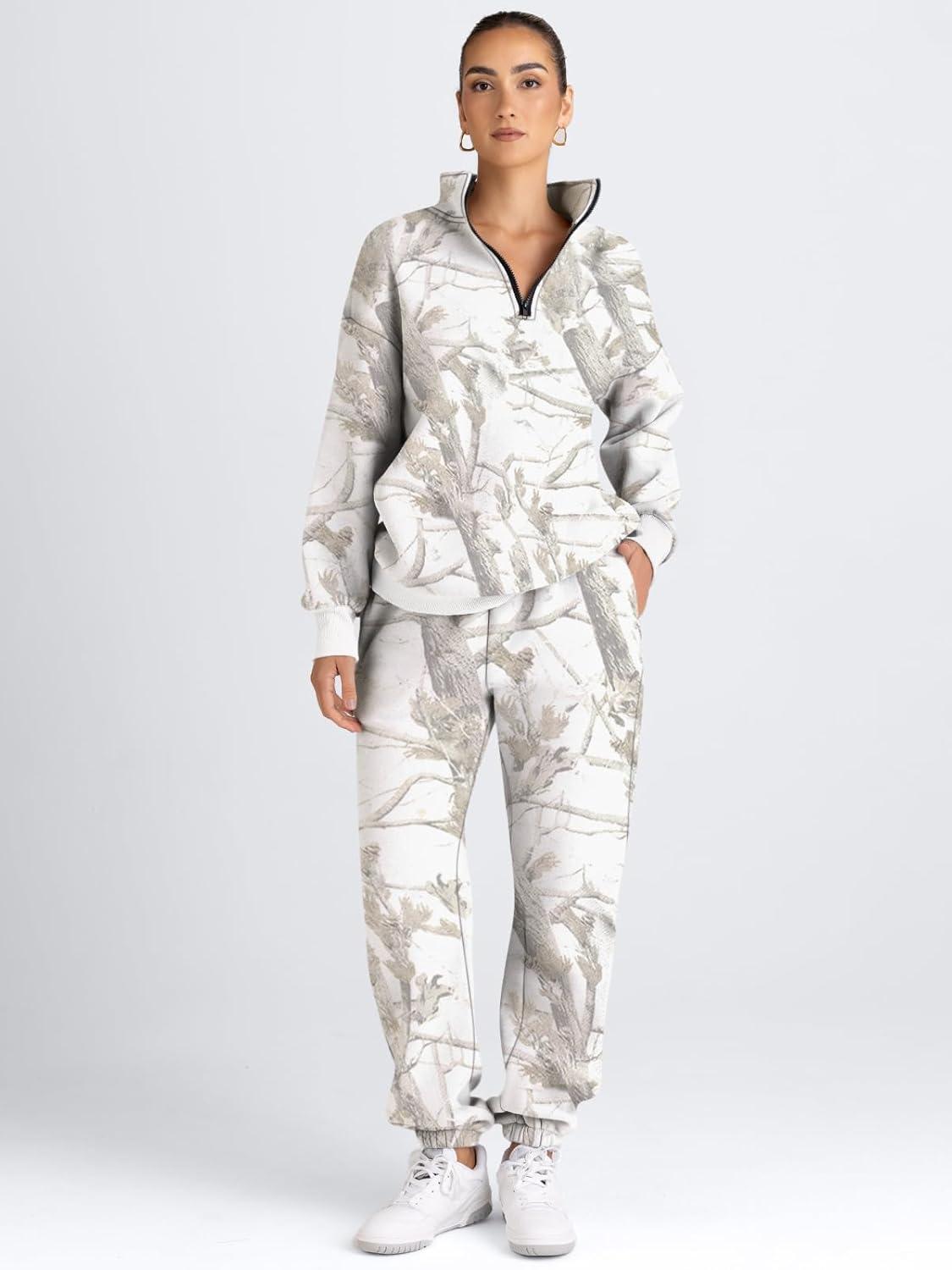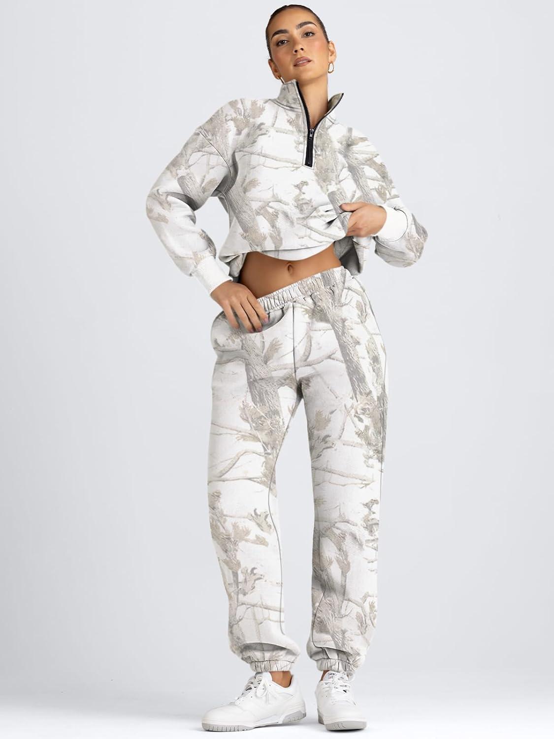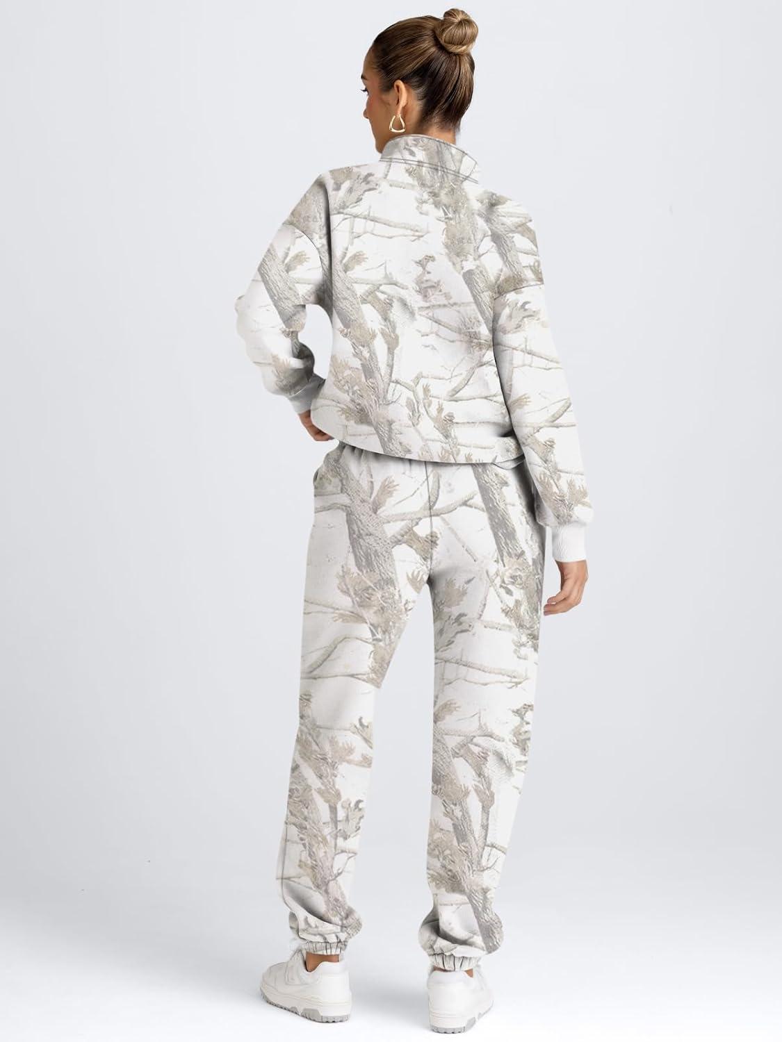 AUTOMET Women’s Sweatsuits 2 Piece Outfits Lounge Sets Long Sleeve Half Zip Pullover and Baggy Sweatpants with Pockets(Camowhite)