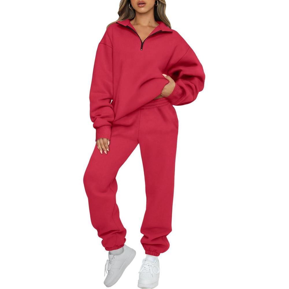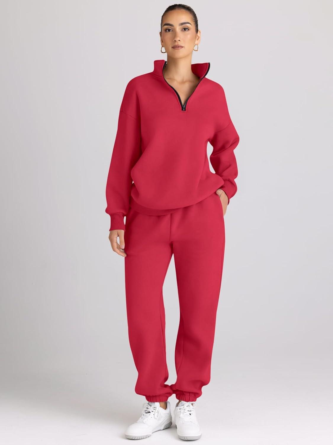 AUTOMET Women’s Sweatsuits 2 Piece Outfits Lounge Sets Long Sleeve Half Zip Pullover and Baggy Sweatpants with Pockets(Red)