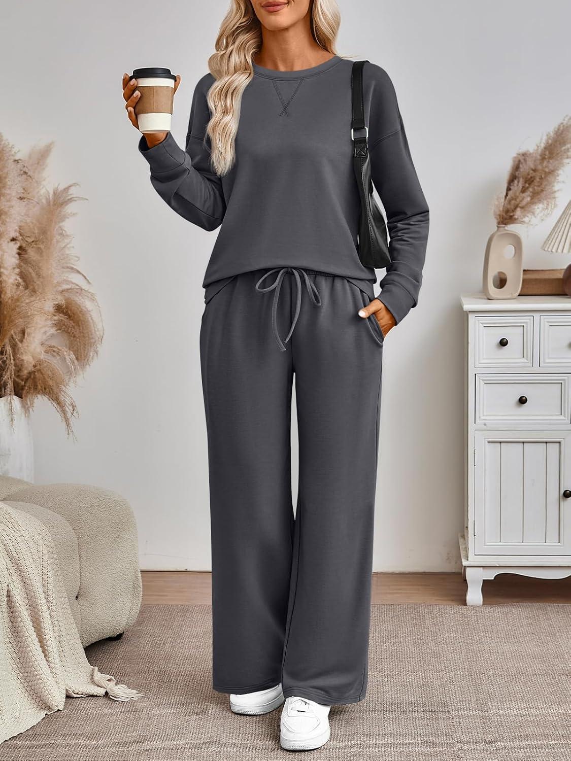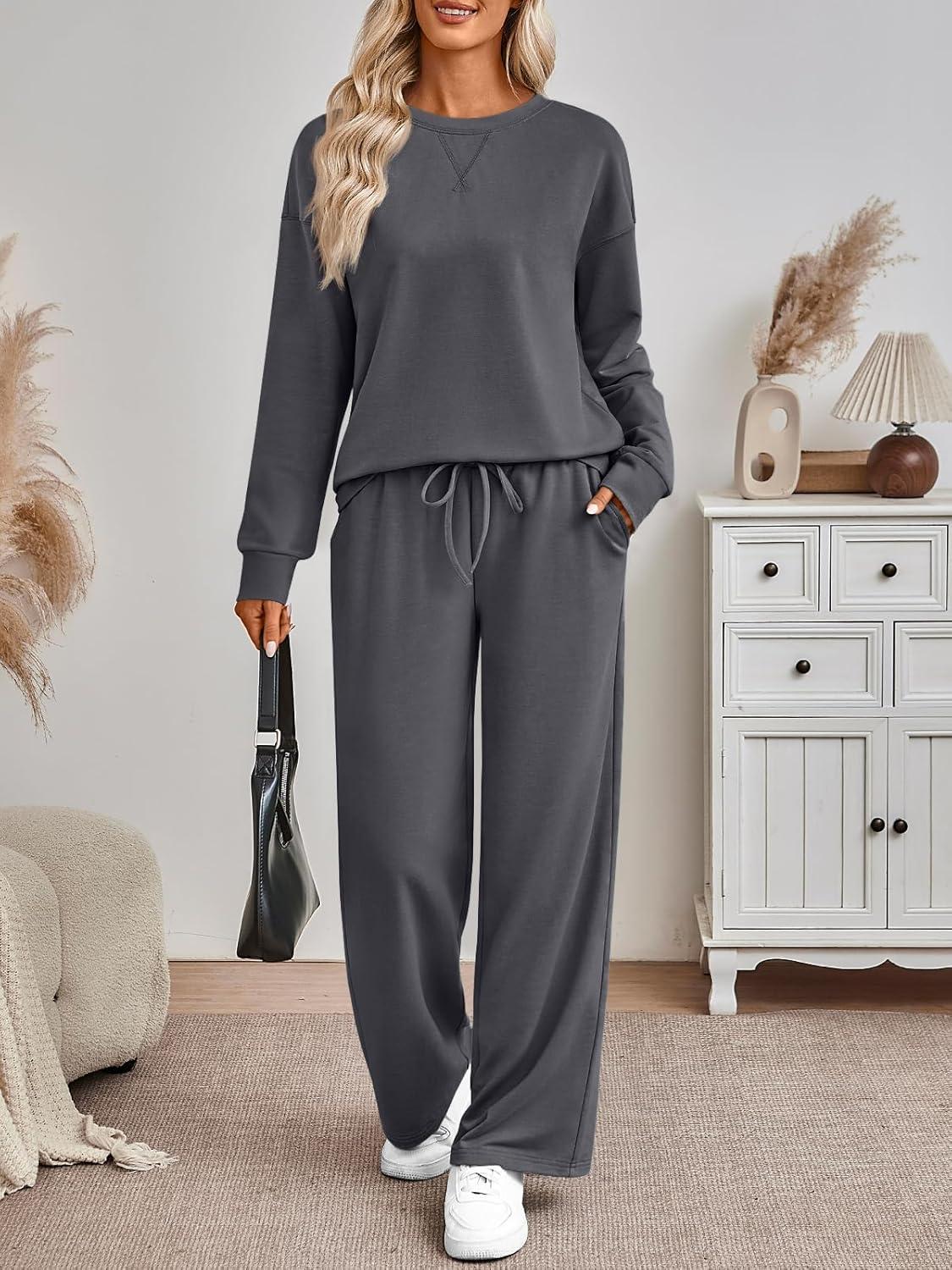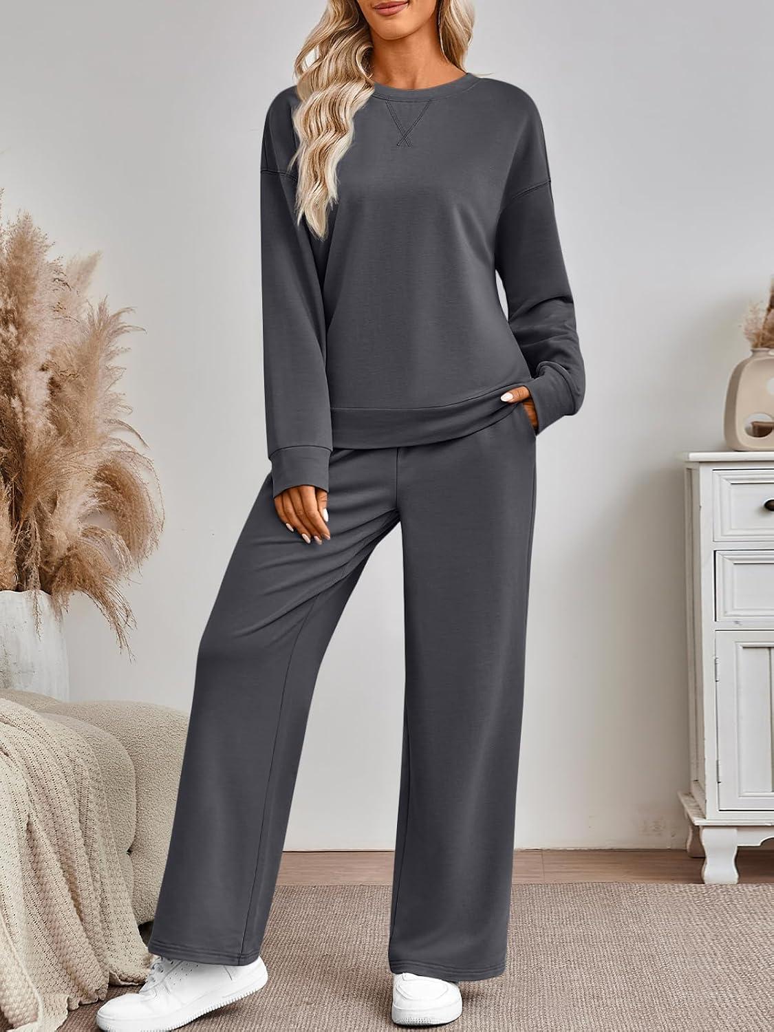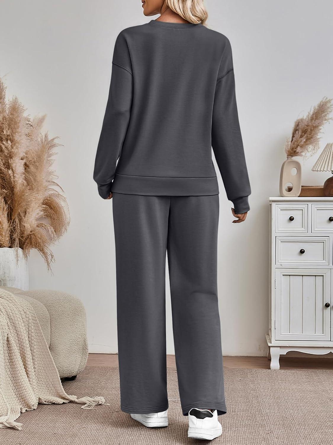 AUTOMET Womens Sweatsuits 2 Piece Sets Travel Outfits 2025 Fall Matching Lounge Set Oversized Sweatshirt Wide Leg Pants(Dark Grey)