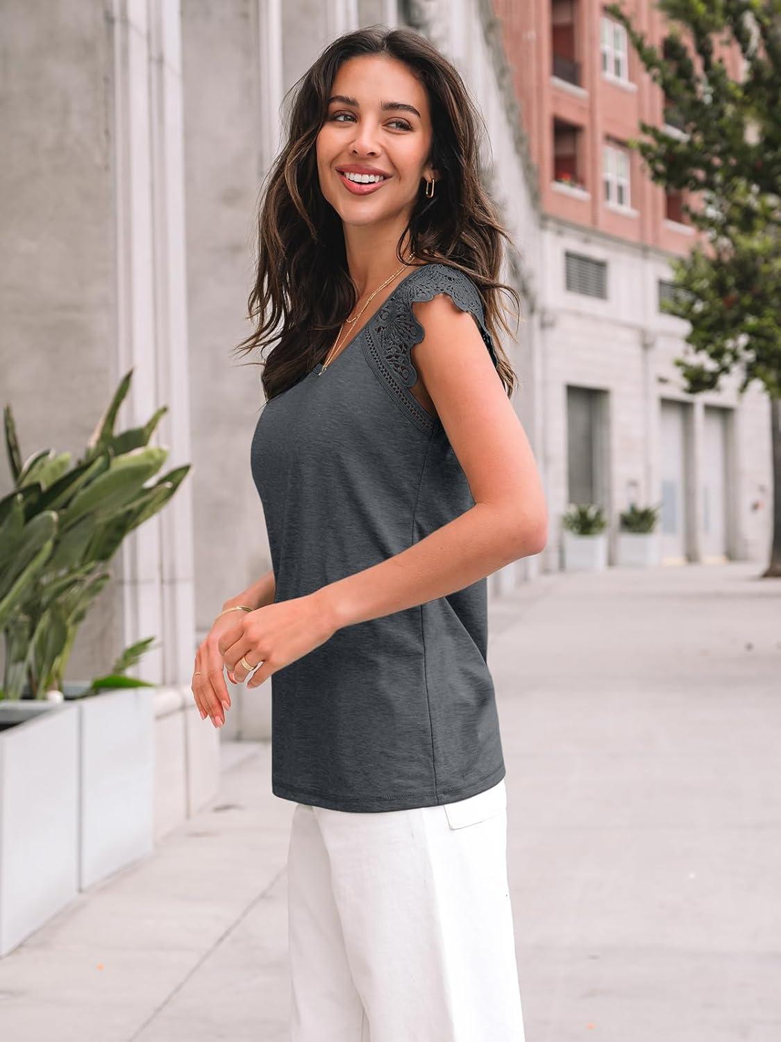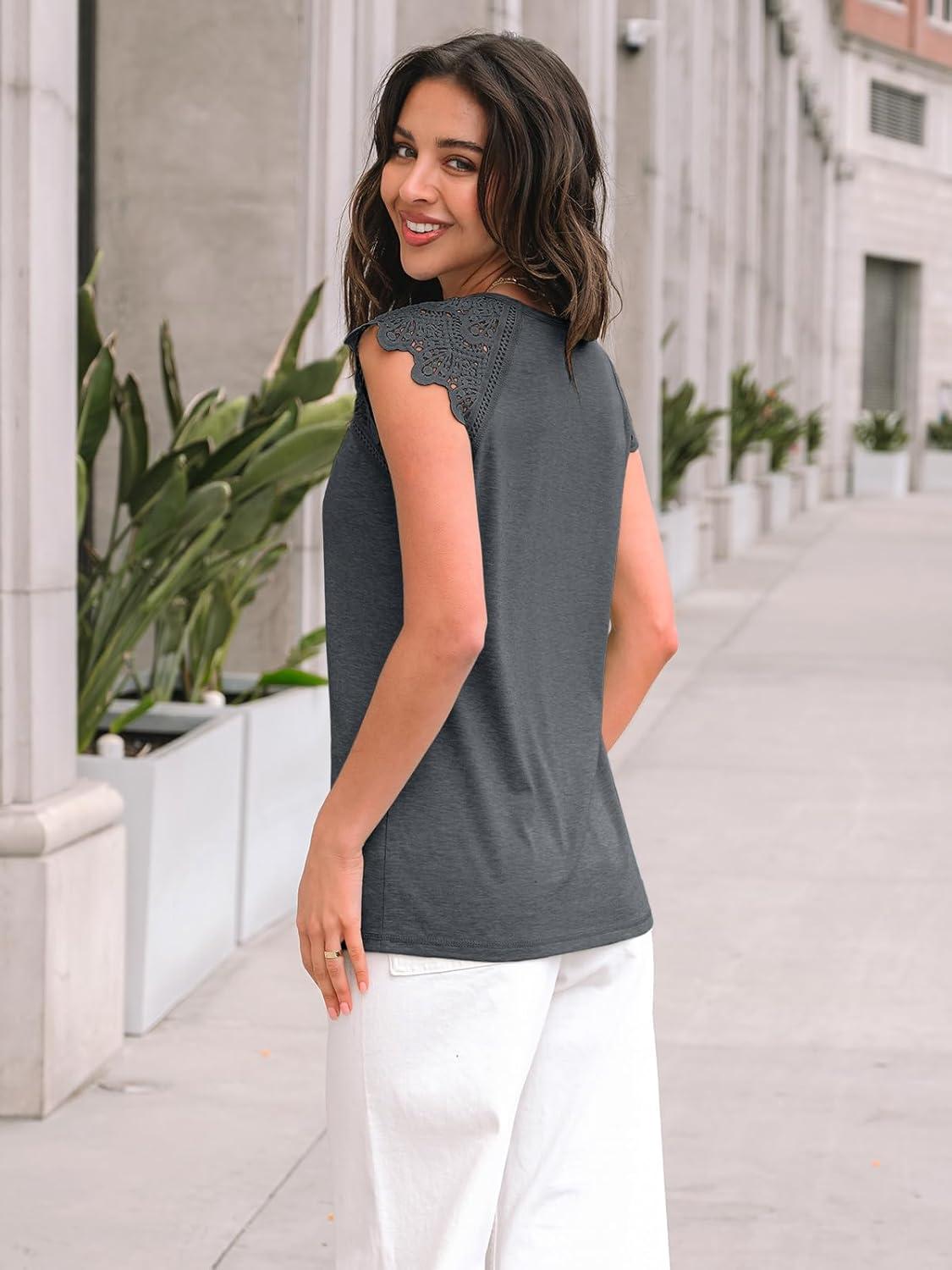 AUTOMET Womens Tops Casual Dressy Lace Summer Tee 2025 Cap Sleeve T Shirts Cute Basic Trendy Fashion Spring Outfits(Blackgrey)