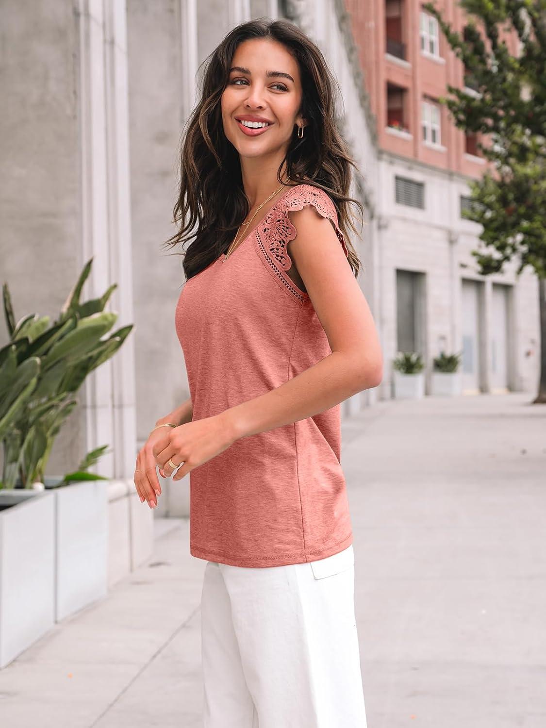 AUTOMET Womens Tops Casual Dressy Lace Summer Tee 2025 Cap Sleeve T Shirts Cute Basic Trendy Fashion Spring Outfits(Coral)
