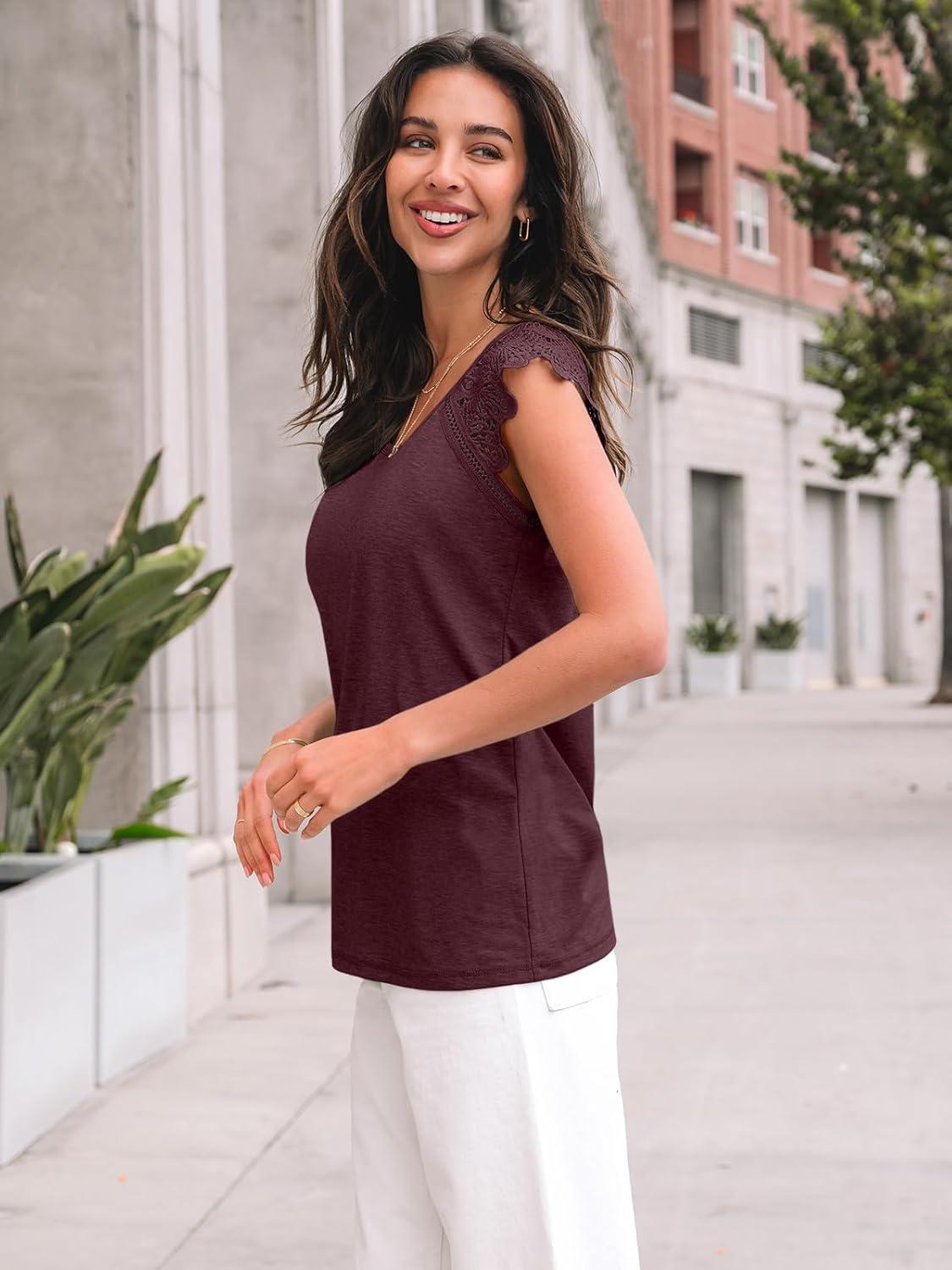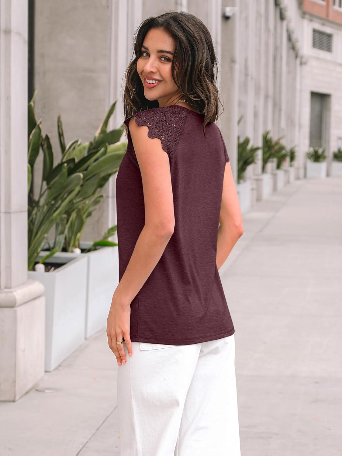 AUTOMET Womens Tops Casual Dressy Lace Summer Tee 2025 Cap Sleeve T Shirts Cute Basic Trendy Fashion Spring Outfits(Winered)